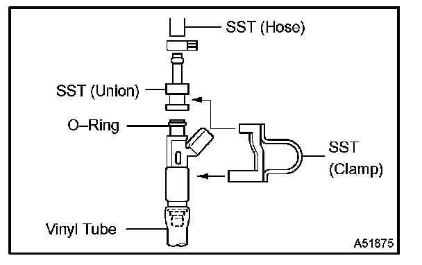 4. Connect SST (union and hose) to the injector, and hold the injector and union with SST (clamp).