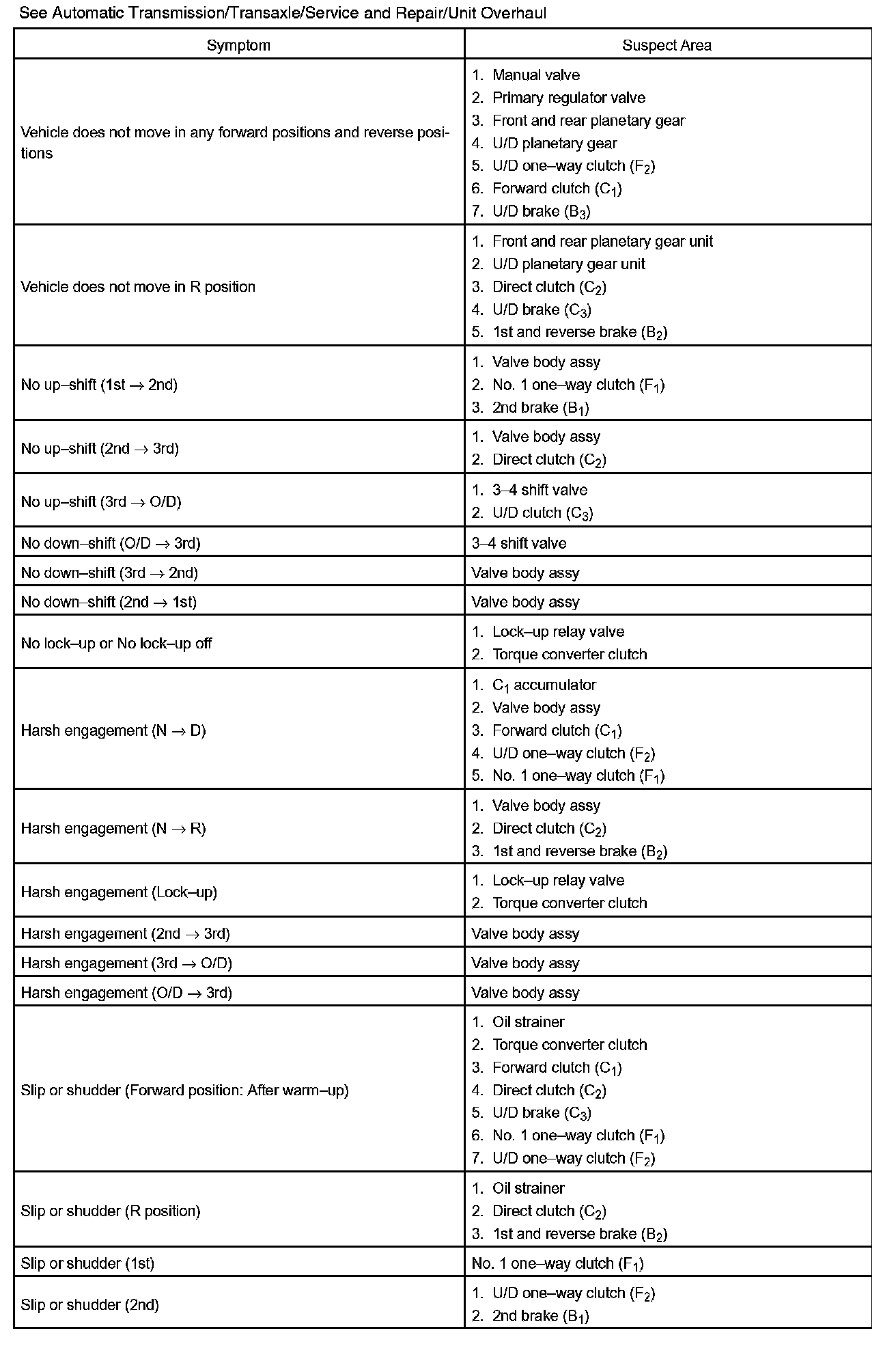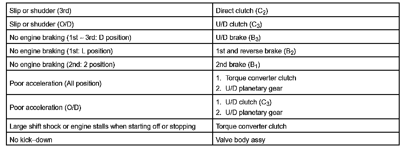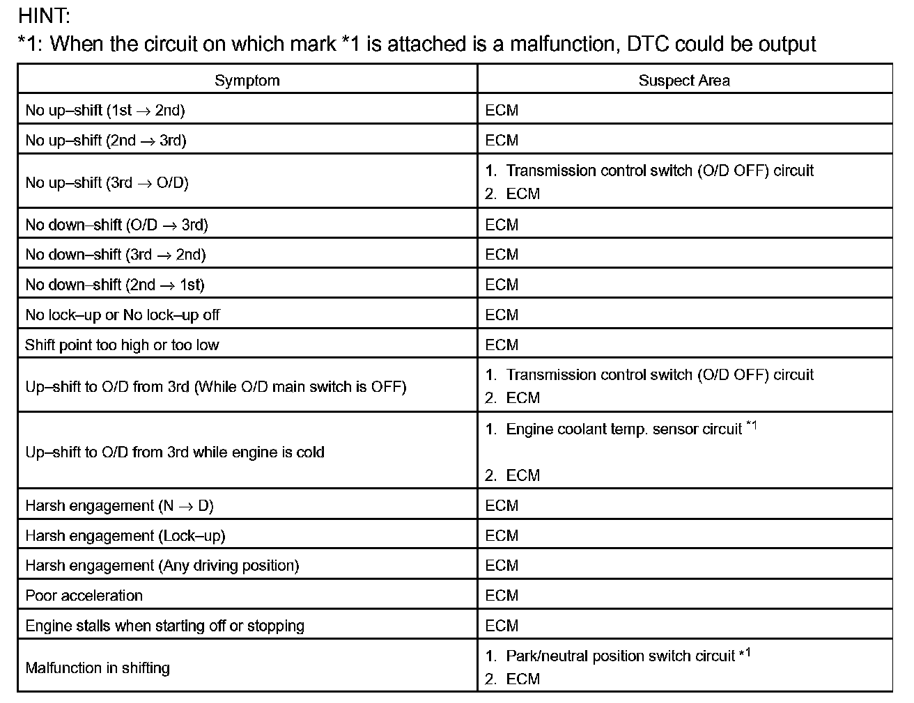 PROBLEM SYMPTOMS TABLEHINT: If a normal code is displayed during the diagnostic trouble code check although the trouble still occurs, check the electrical circuits for each symptom in the order given in the charts and proceed to the given troubleshooting.