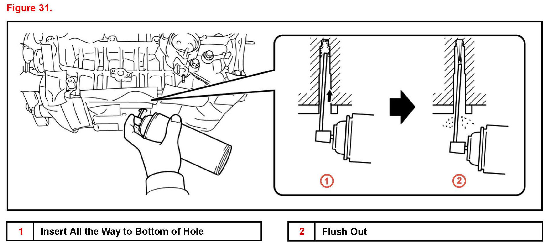 E. Insert the nozzle all the way into the bolt hole and spray brake cleaner into the hole in order to flush out the cutting particles from inside it.