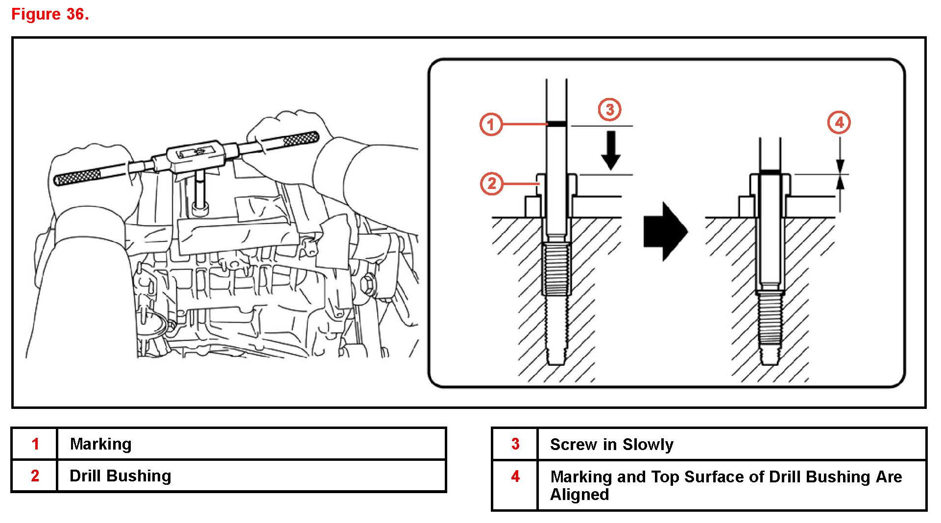 G. Repeat steps 9B through 9F until the marking on the tap is aligned with the top surface of the bushing.