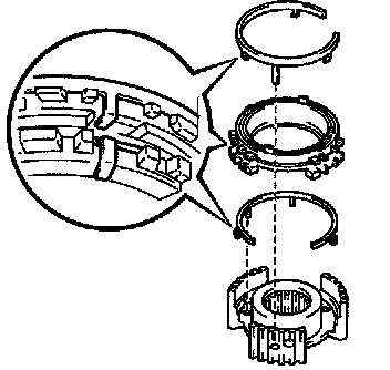 ^ Engage the shifting key spring claw to the center of the teeth of the synchronizer ring.
