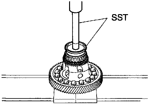 b. Using SST and press, install the FR differential case rear tapered roller bearing (inner race) to the front differential case.