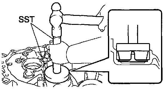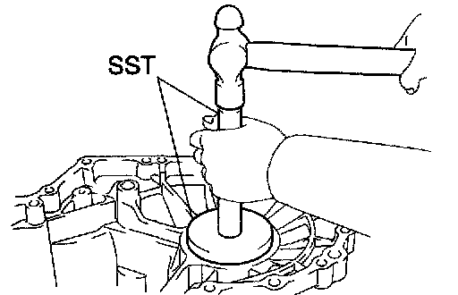 a. Using SST and a hammer, install the FR differential case rear tapered roller bearing (outer race) to the front transaxle case.