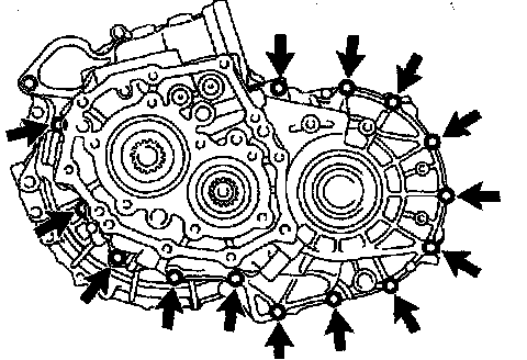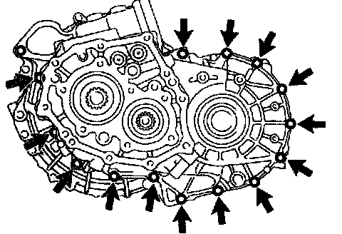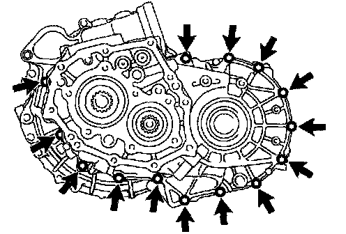 g. Remove the 14 bolts and manual transmission case to the manual transaxle case.