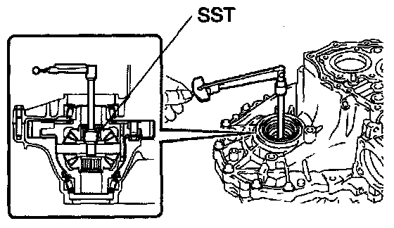 b. Using SST, remove the front differential case rear tapered roller bearing from the front differential case.