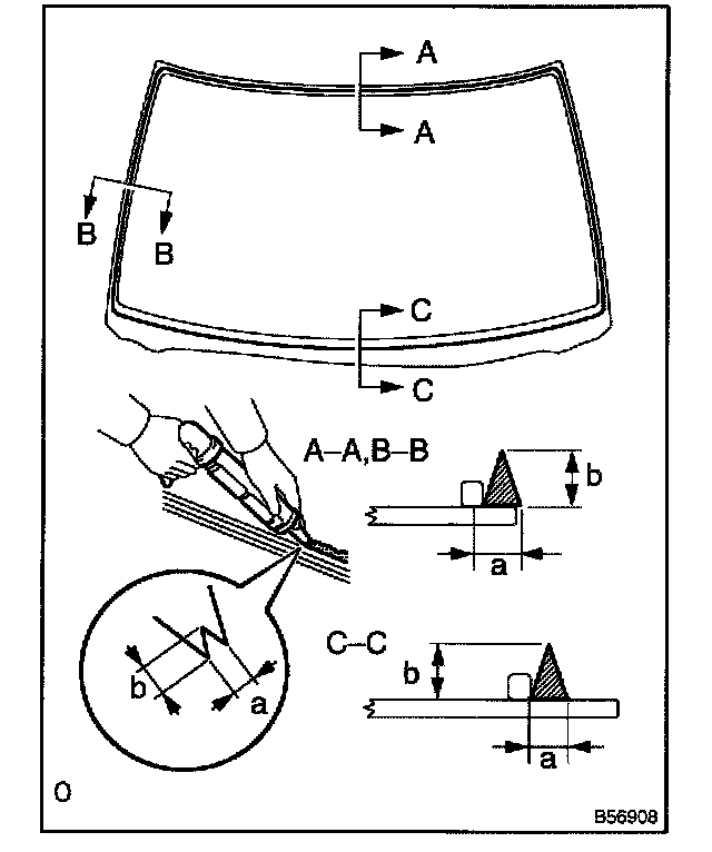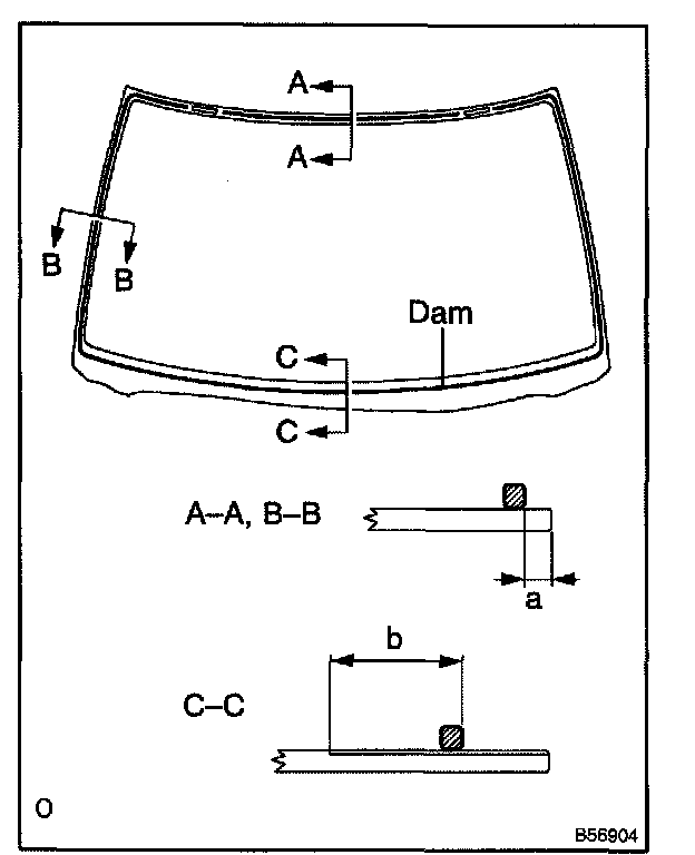 b. Install a new window glass adhesive dam as shown in the illustration.