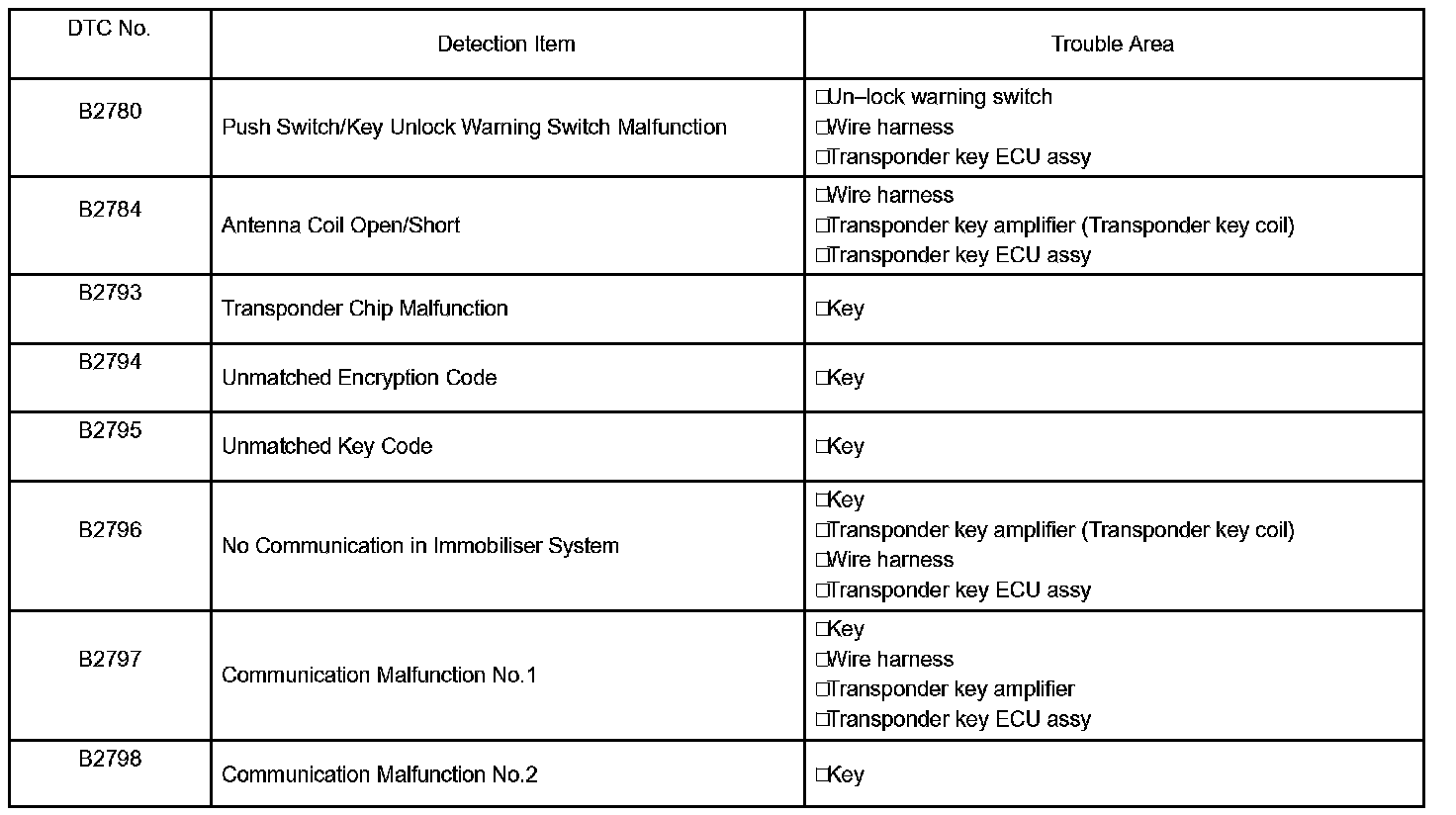 DIAGNOSTIC TROUBLE CODE CHARTB2780 - B2798: