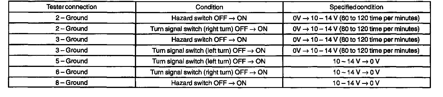 b. Connect the connector to turn signal flasher and inspect the wire harness side connector from the back side as shown in the chart.