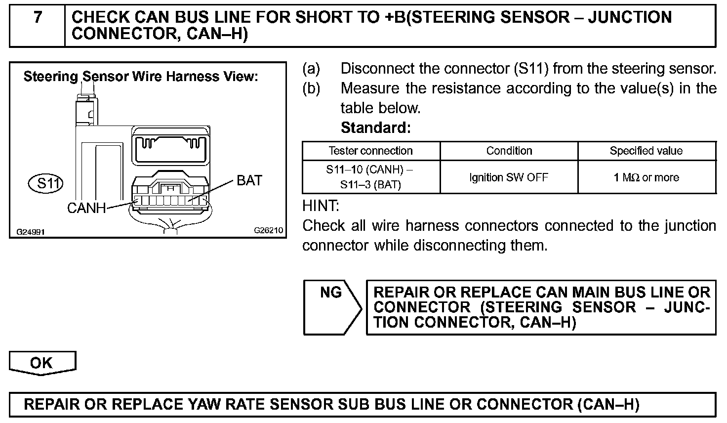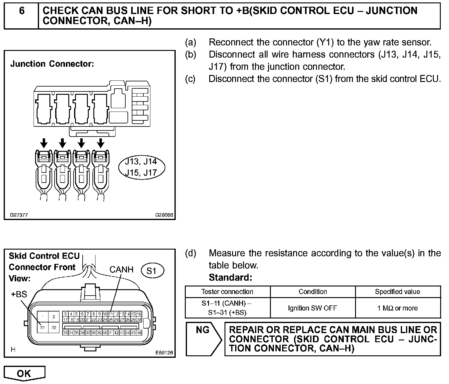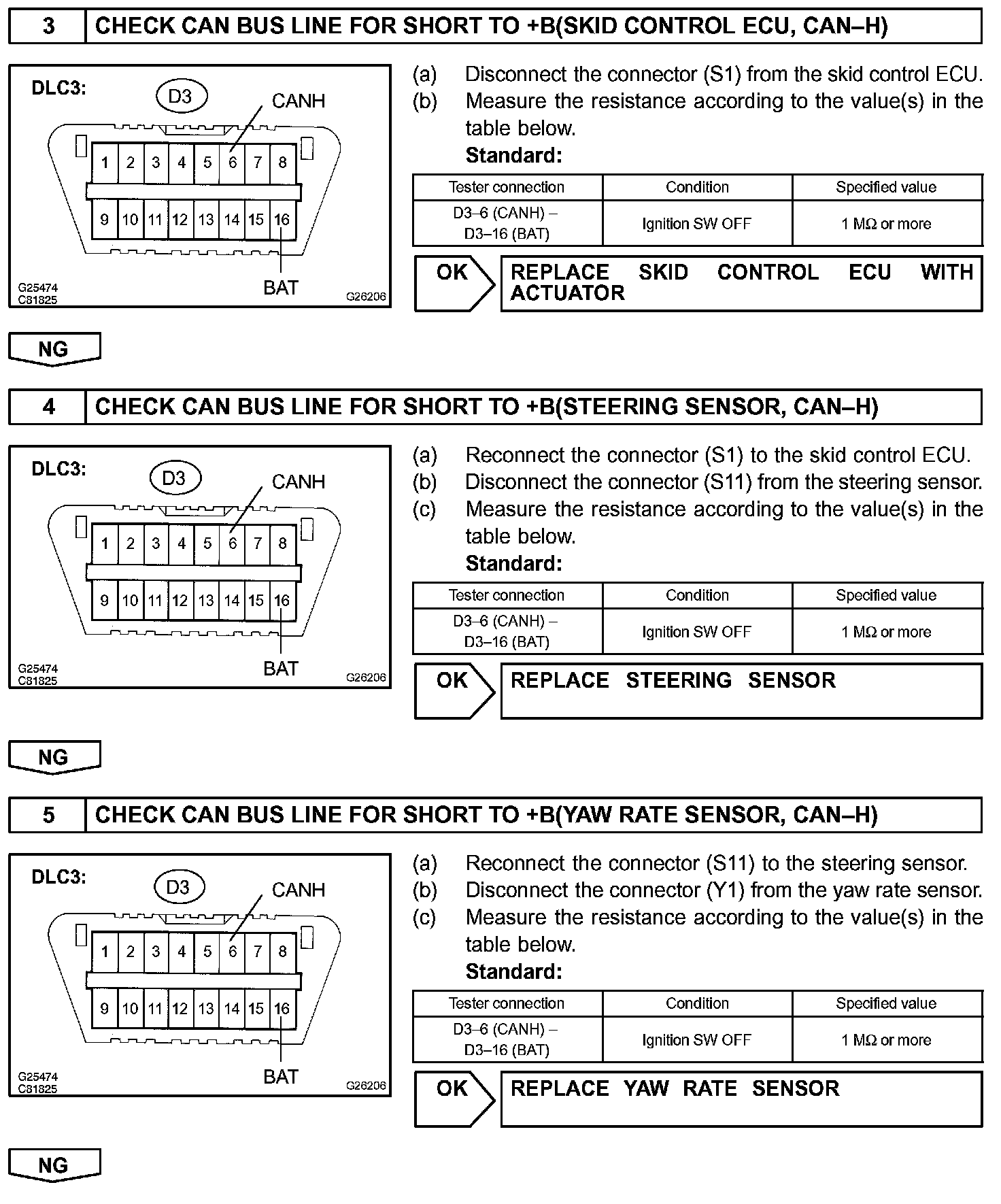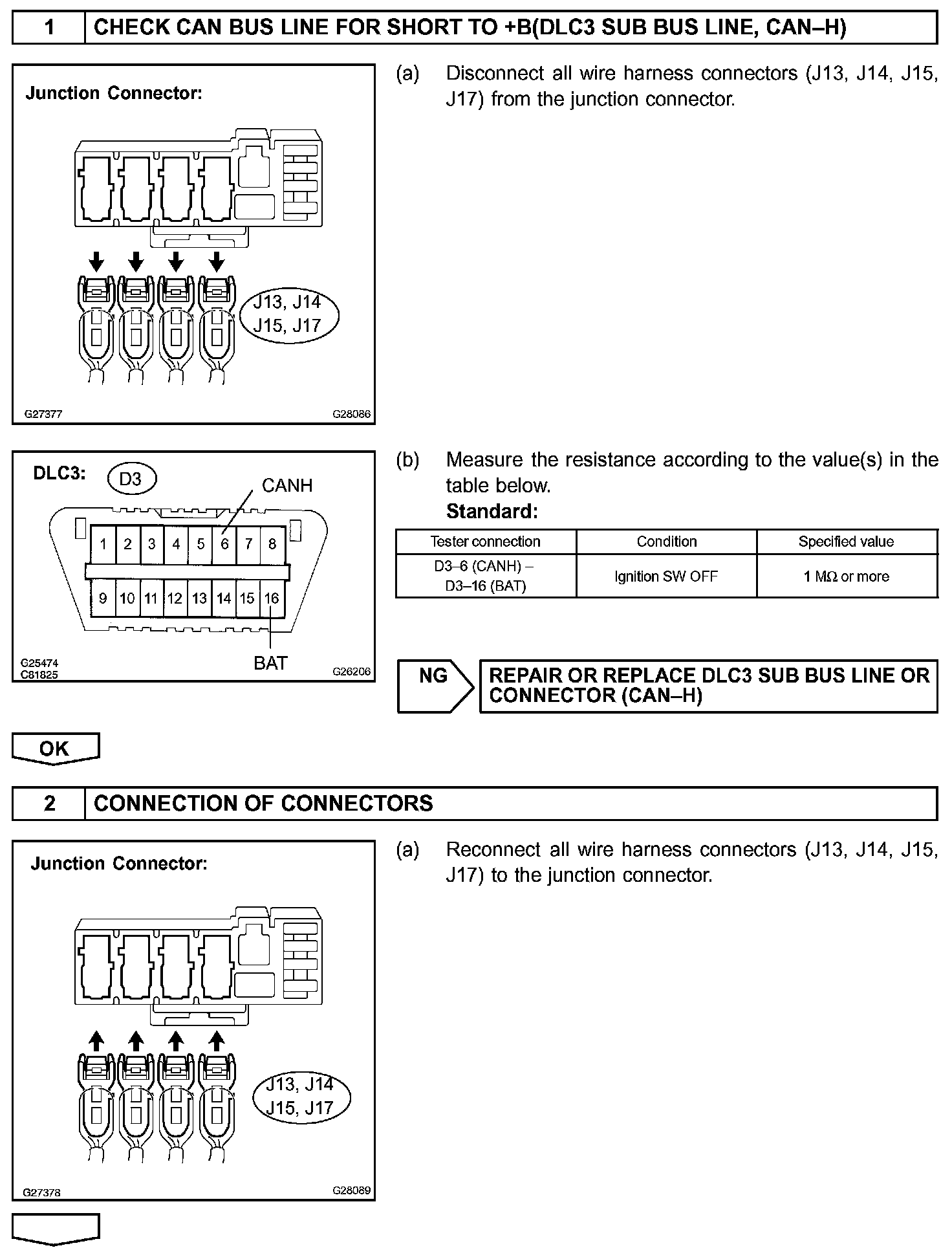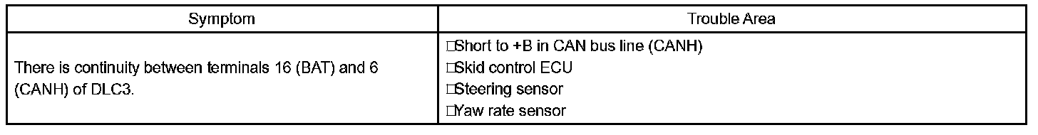 A short to +B is suspected in the CAN bus line when there is continuity between terminals 16 (BAT) and 6 (CANH) of the DLC3.