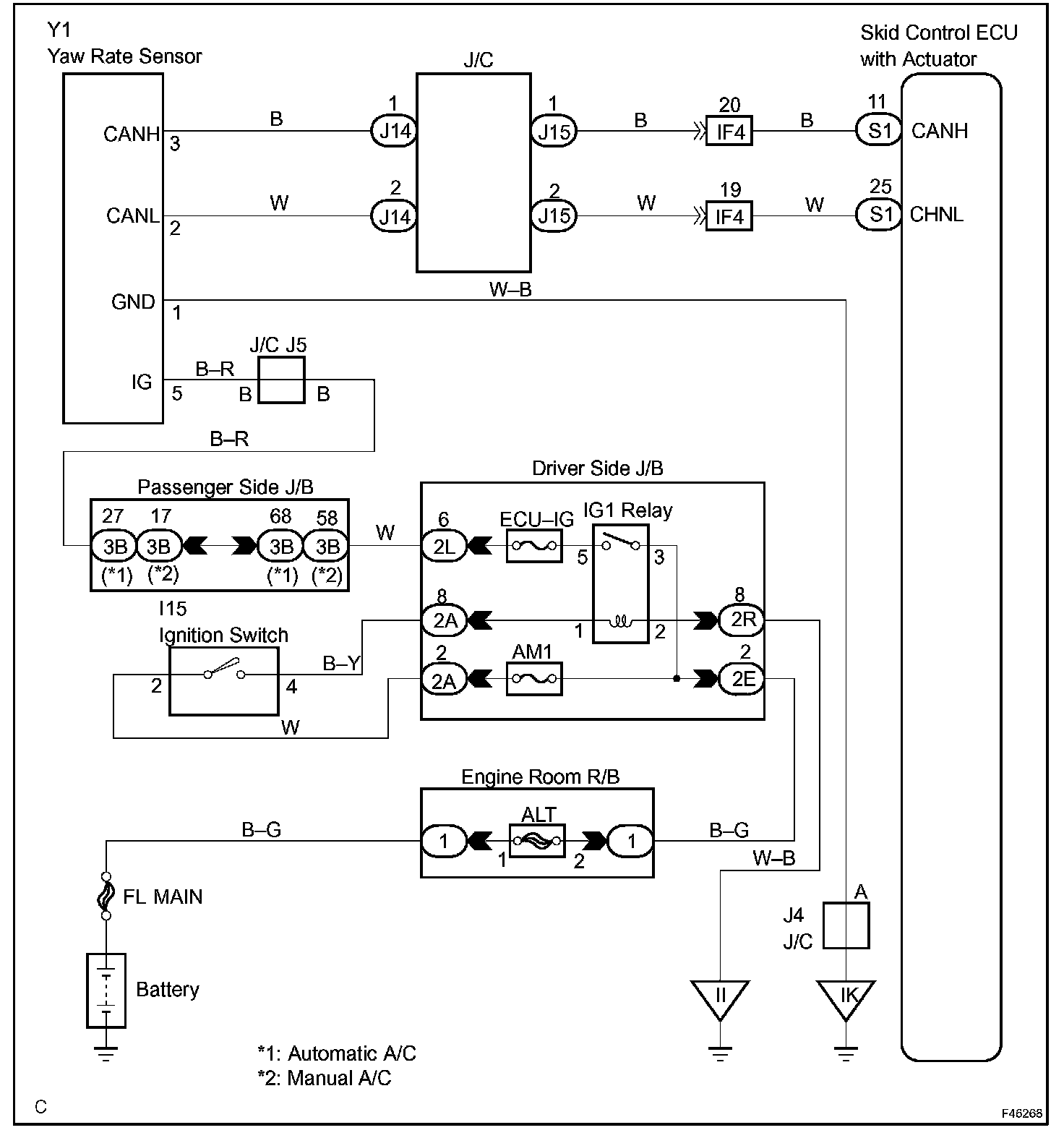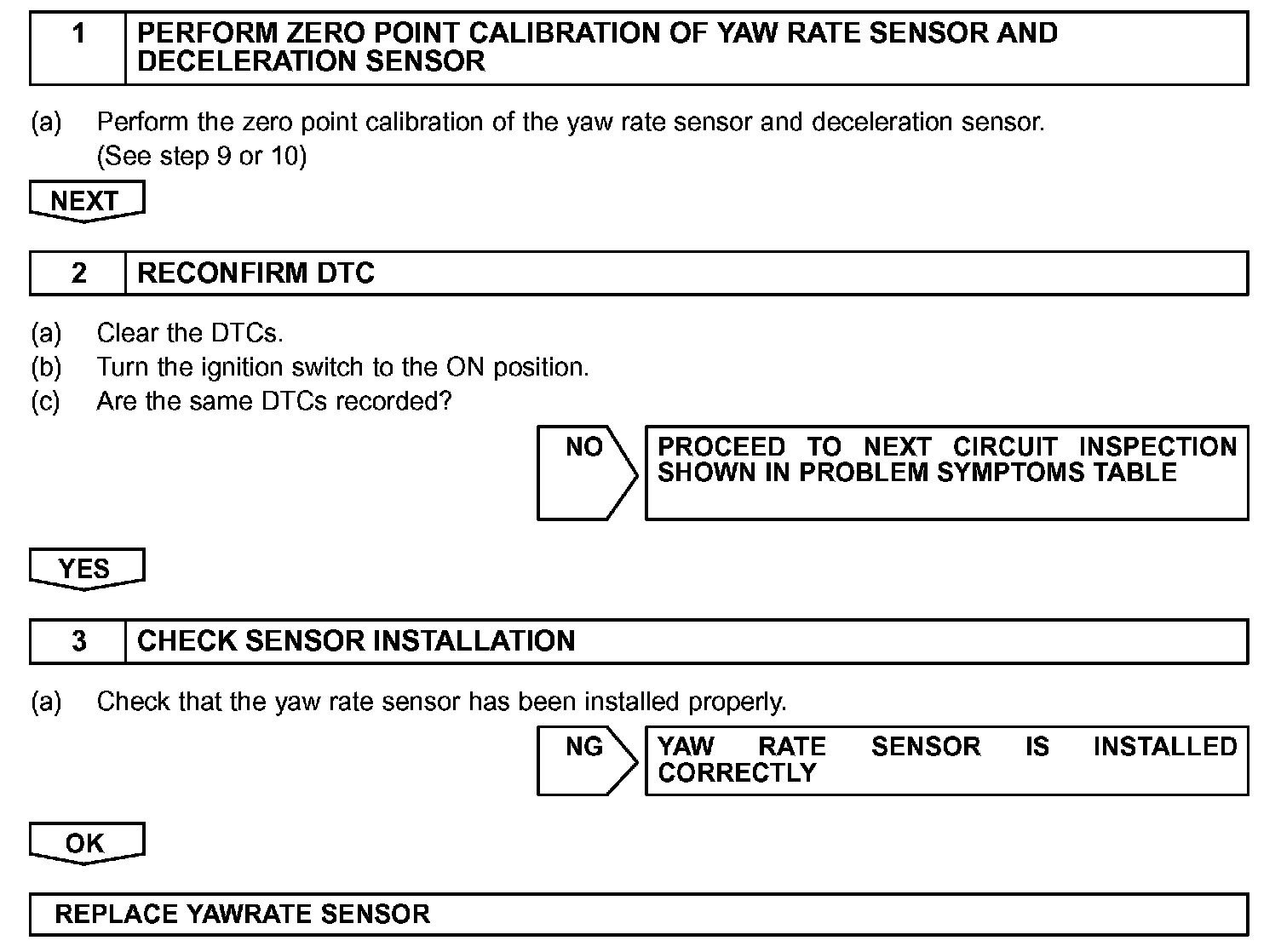 If there is trouble in the bus lines between yaw rate sensor and CAN communication system, the DTC U0123/62 (yaw rate sensor communication trouble) and U0124/95 (Deceleration sensor communication trouble) are output.