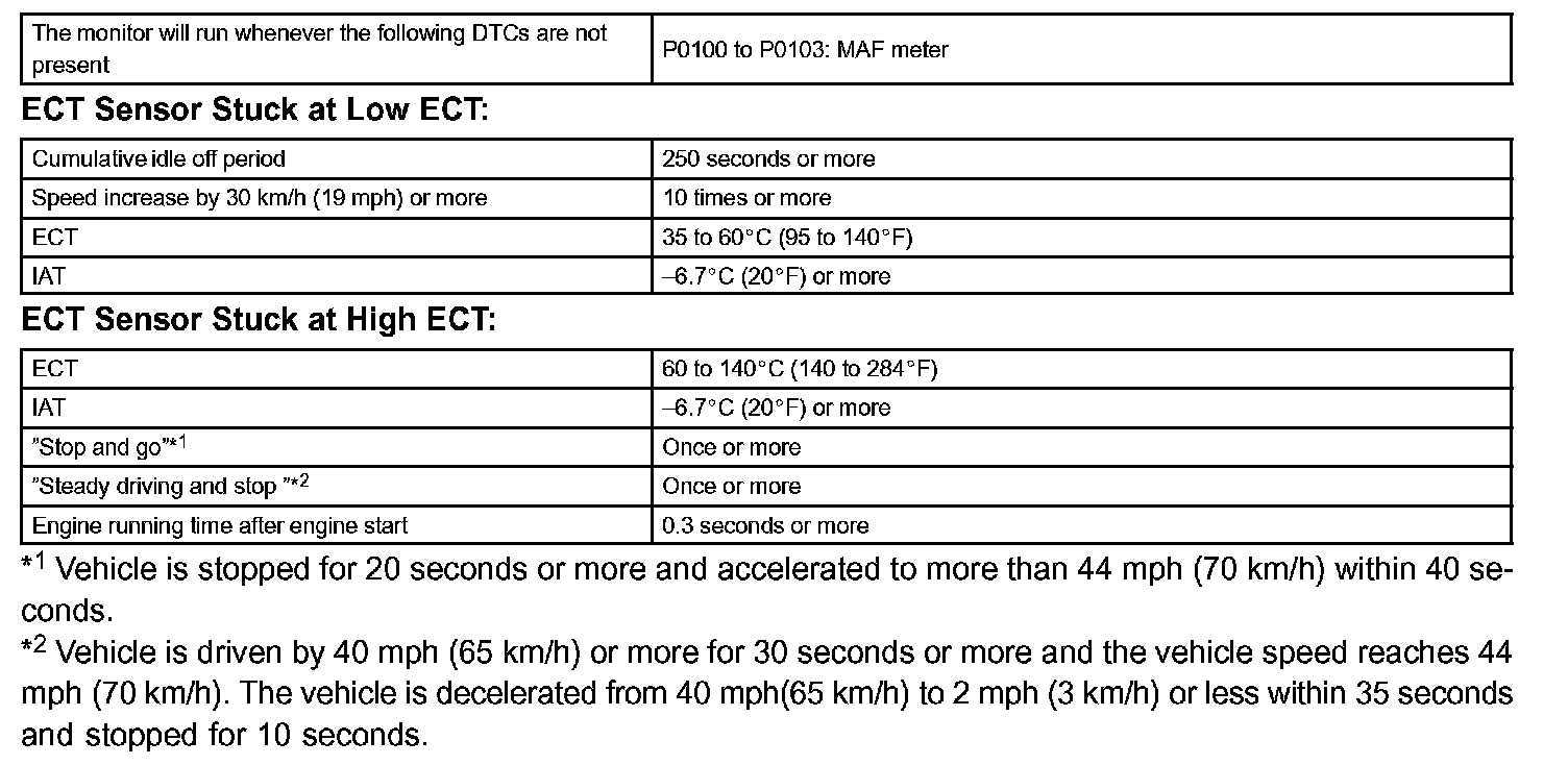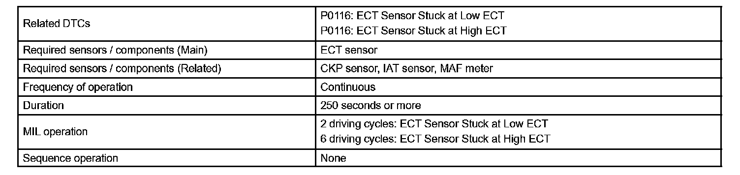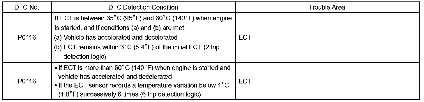 2. Upon starting the engine, the ECT is over 60°C (140°F). If, after driving for 250 seconds, the ECT still remains within 1°C (1.8°F) of the starting temperature, a DTC will be set (6 trip detection logic).