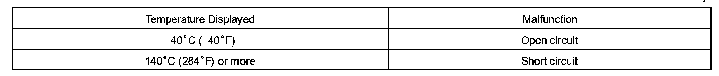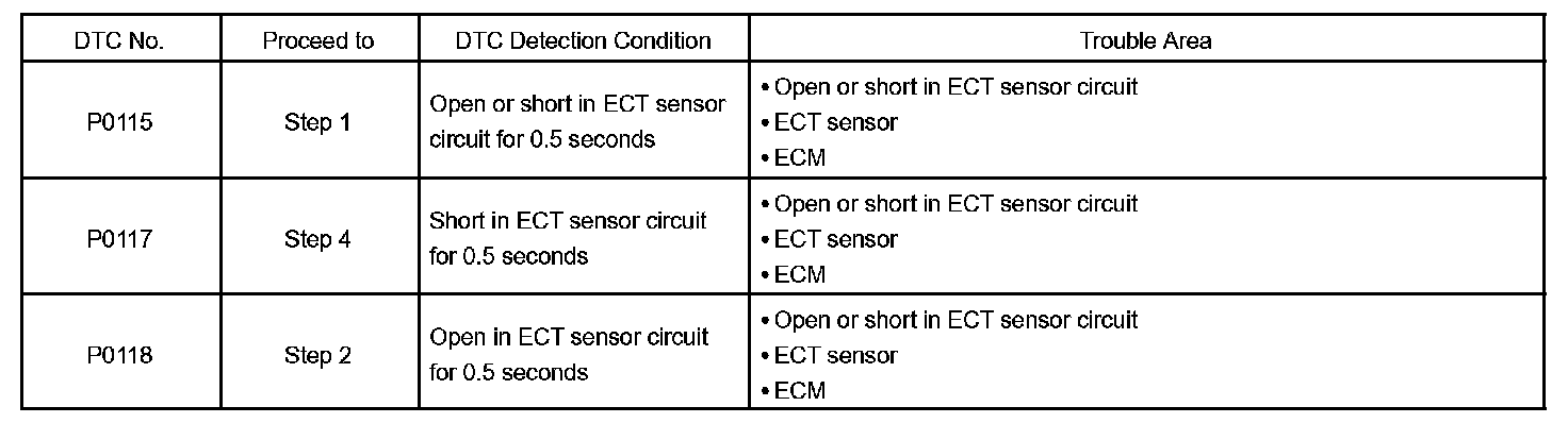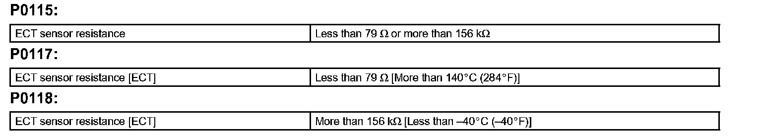 When the ECM calculates that the ECT is -40°C (-40°F) or more than 140°C (284°F) and if either condition continues 0.5 seconds or more, the ECM will set a DTC.