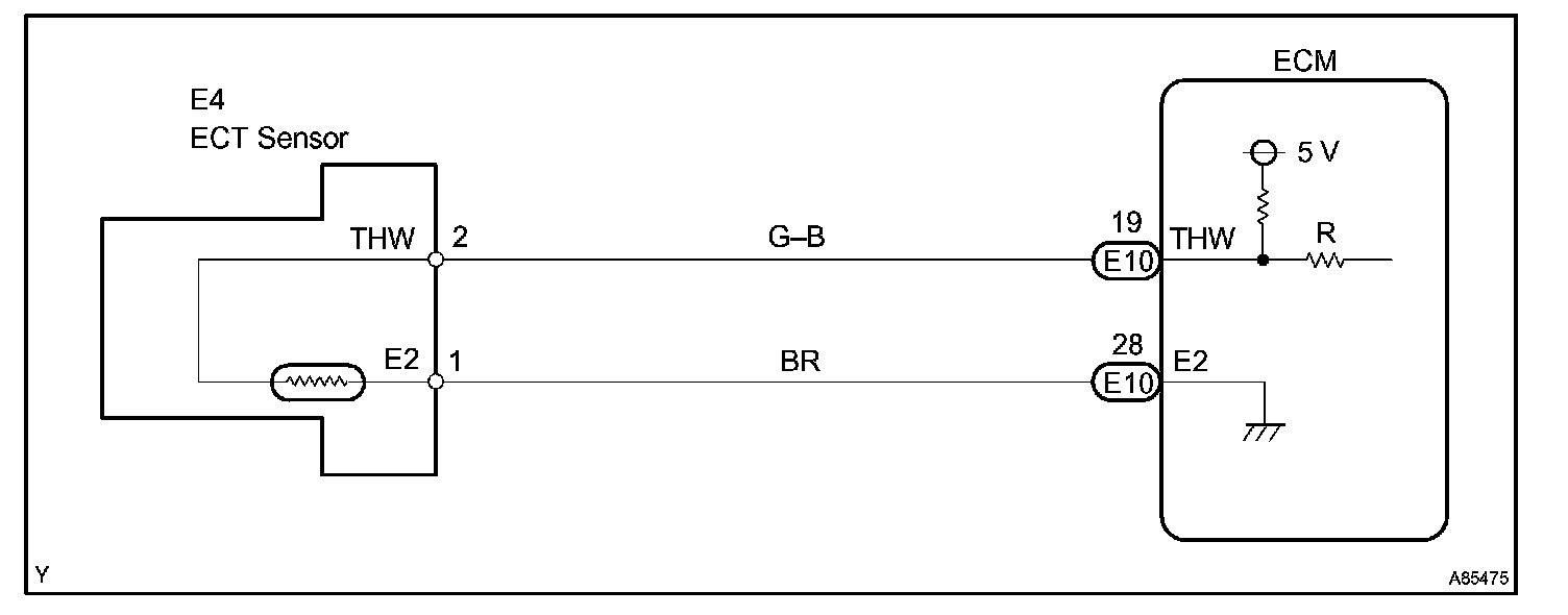 A thermistor is built in the Engine Coolant Temperature (ECT) sensor and changes the resistance value according to the engine coolant temperature.