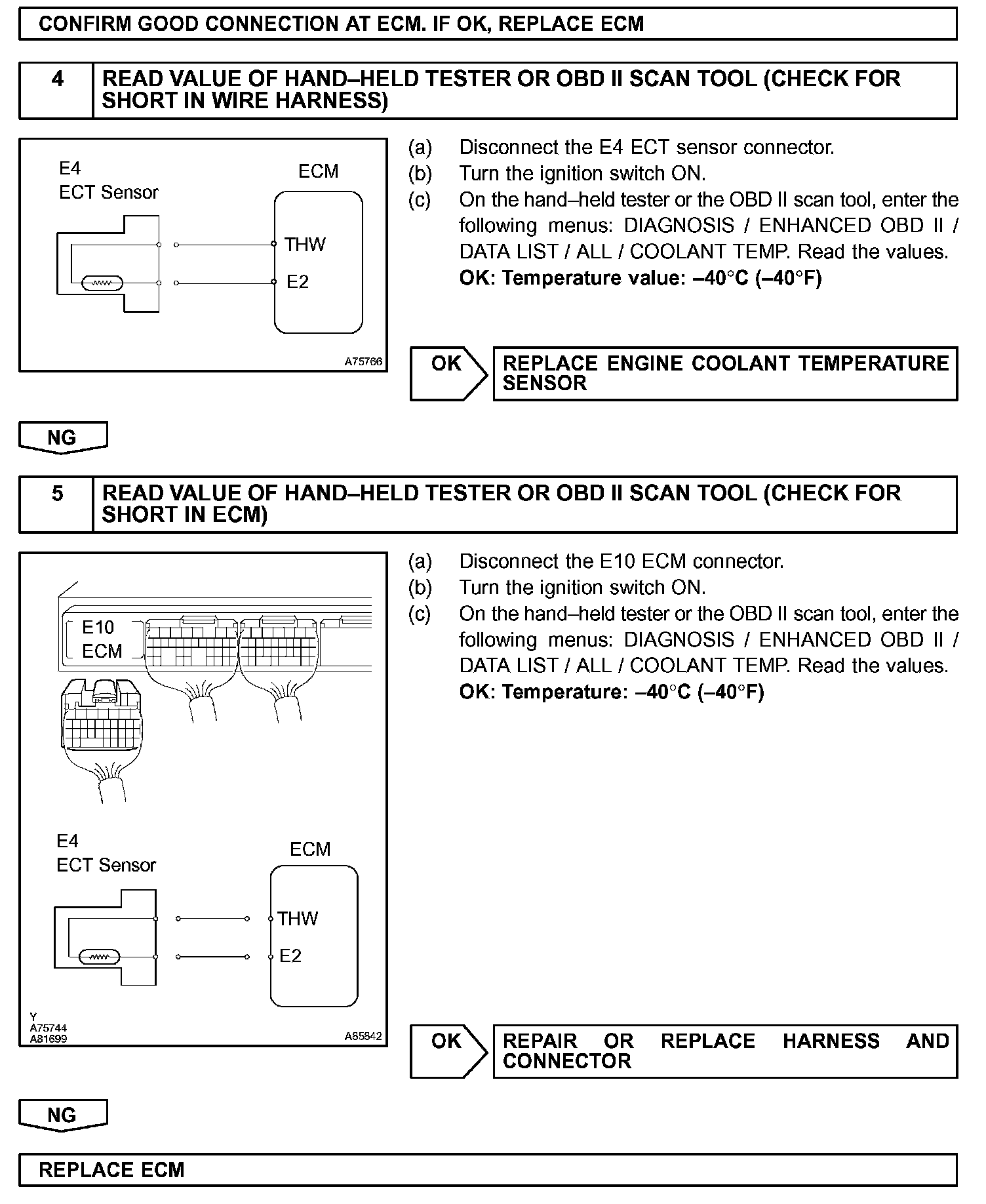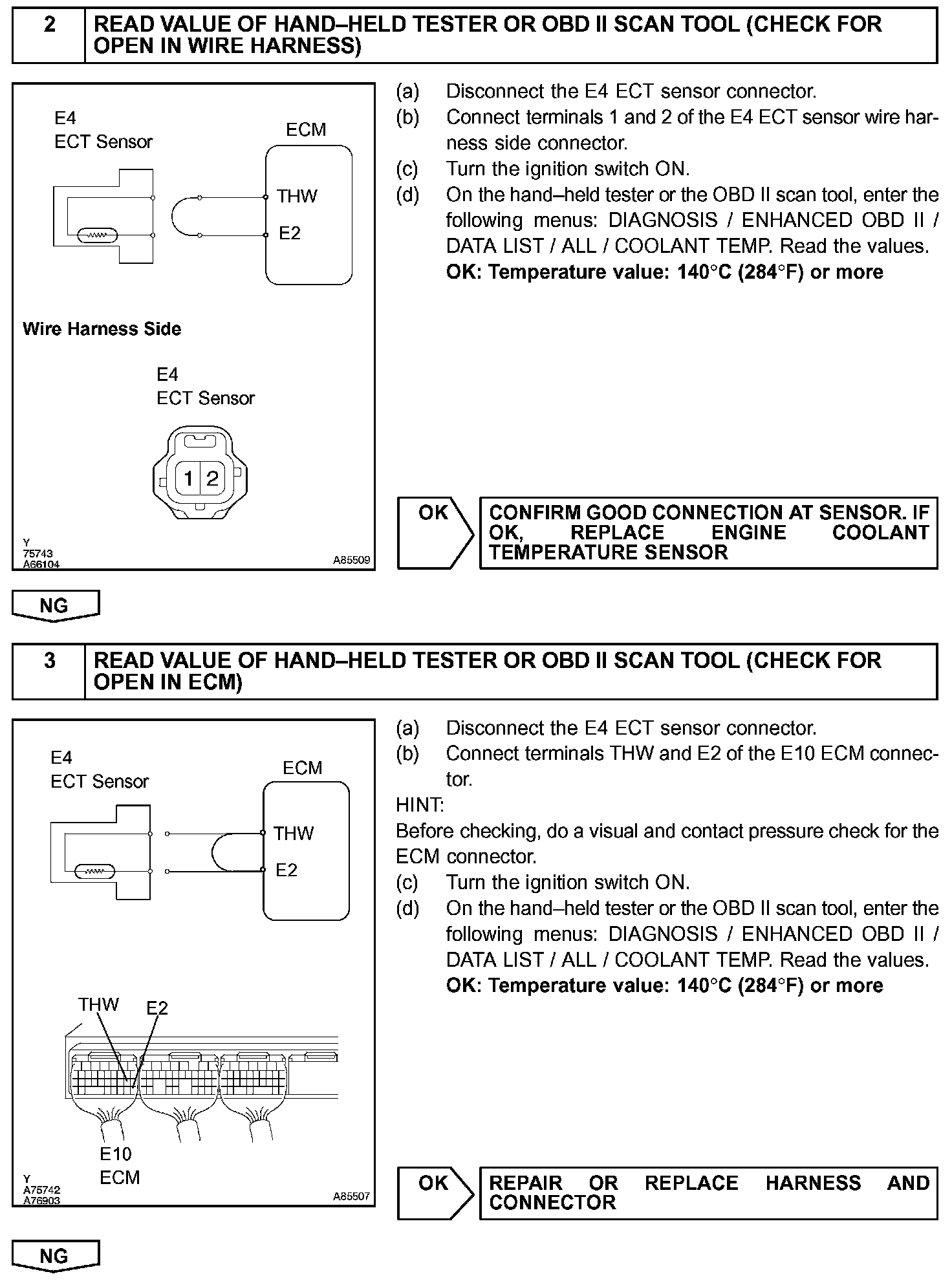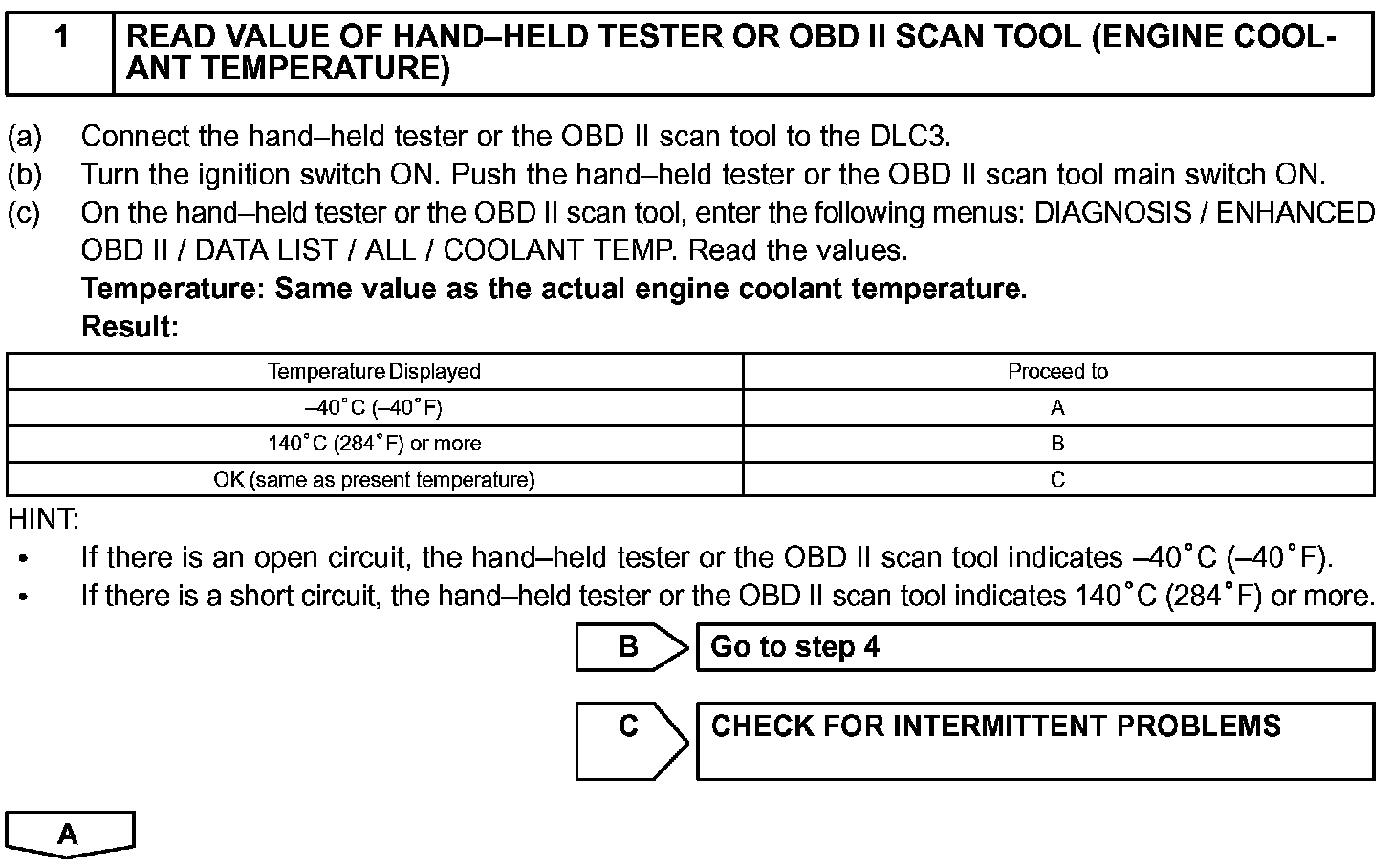 HINT: After confirming DTC P0115, P0117 or P0118, use the hand-held tester or the OBD II scan tool to confirm the ECT from the ALL menu (to reach the ALL menu: DIAGNOSIS / ENHANCED OBD II / DATA LIST / ALL).