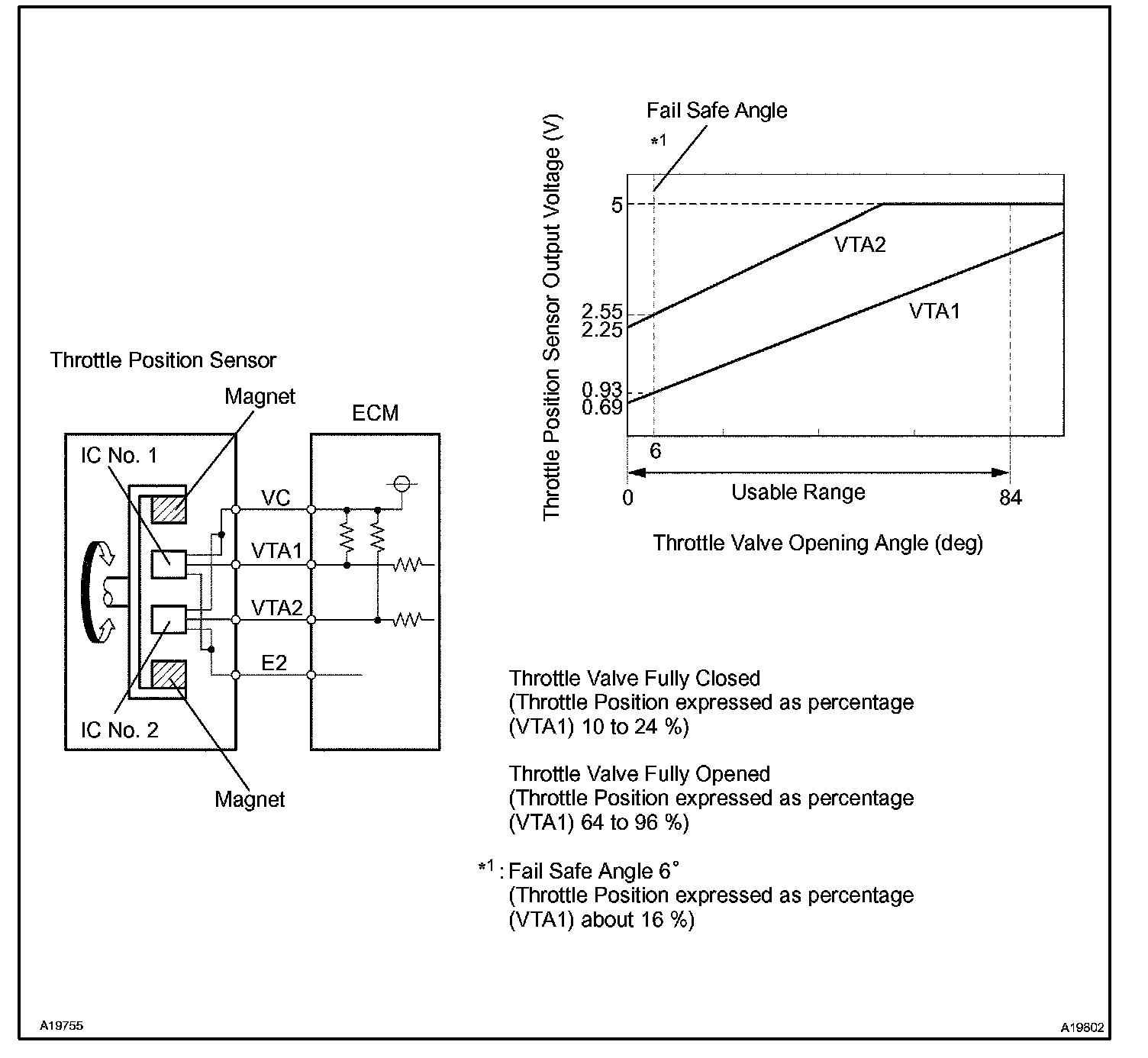 This sensor includes 2 signals: VTA1 and VTA2. VTA1 is used to detect the throttle opening angle and VTA2 is used to detect malfunctions in VTA1. There are several checks that the ECM performs to confirm proper operation of the throttle position sensor and VTA1.