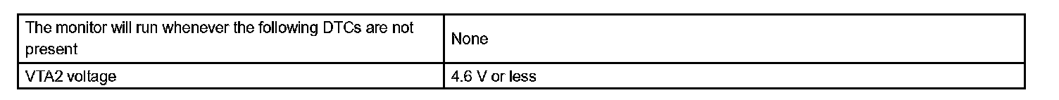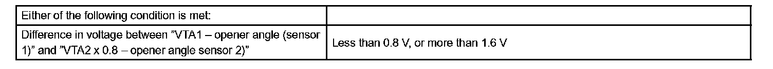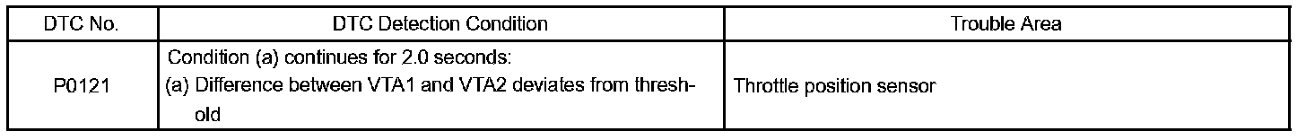 The VTA1 and VTA2 voltage output difference should be less than 0.1 V and more than 0.4 V. If the voltage output difference deviates from this range, the ECM concludes the throttle position sensor has a malfunction. The ECM will turn on the MIL and a DTC is set.