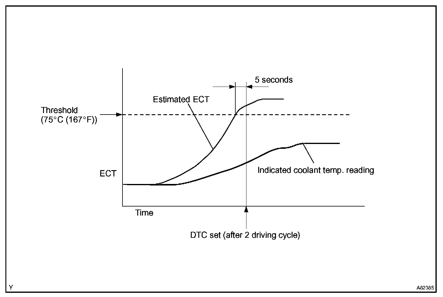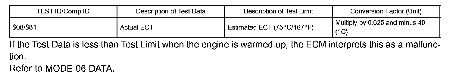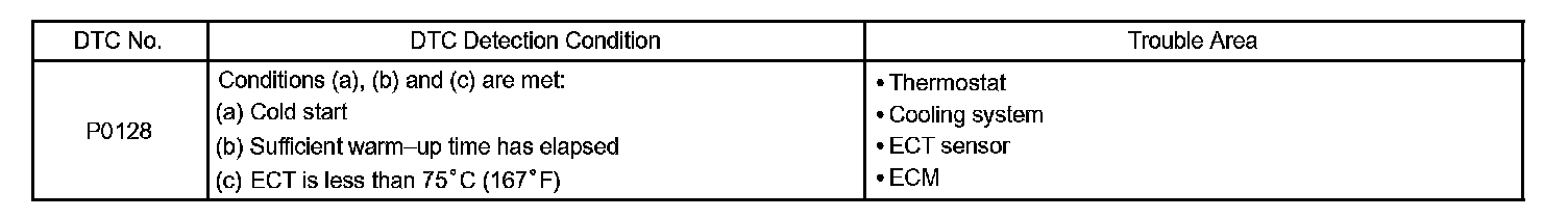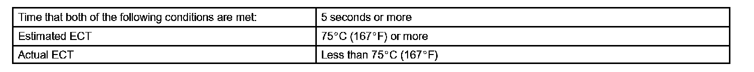 This DTC is output when the Engine Coolant Temperature (ECT) does not reach 75°C (167°F) despite sufficient engine warm-up time.