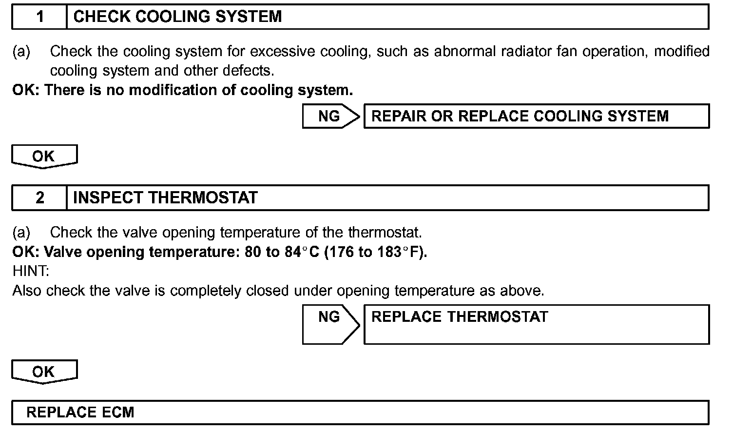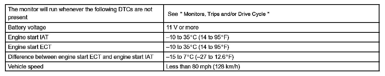 The ECM estimates the coolant temperature based on starting temperature, engine loads, and engine speeds. The ECM then compares the estimated temperature with the actual ECT. When the estimated coolant temperature reaches 75°C (167°F), the ECM checks the actual ECT. If the actual ECT is less than 75°C (167°F), the ECM will interpret this as a fault in the thermostat or engine cooling system and set a DTC.