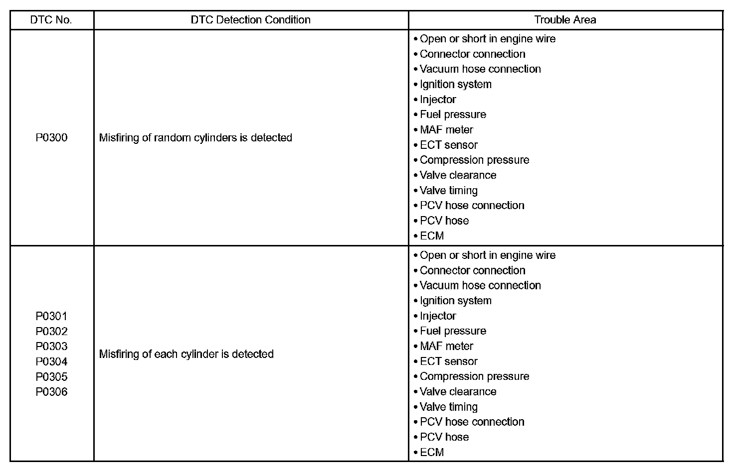 - On 6 and 8 cylinder engines, cylinder specific misfire fault codes are disabled at high engine speeds.If the misfire starts in a high engine speed area or the misfire occurs only in a high engine speed area, only the general fault code P0300 will be stored.