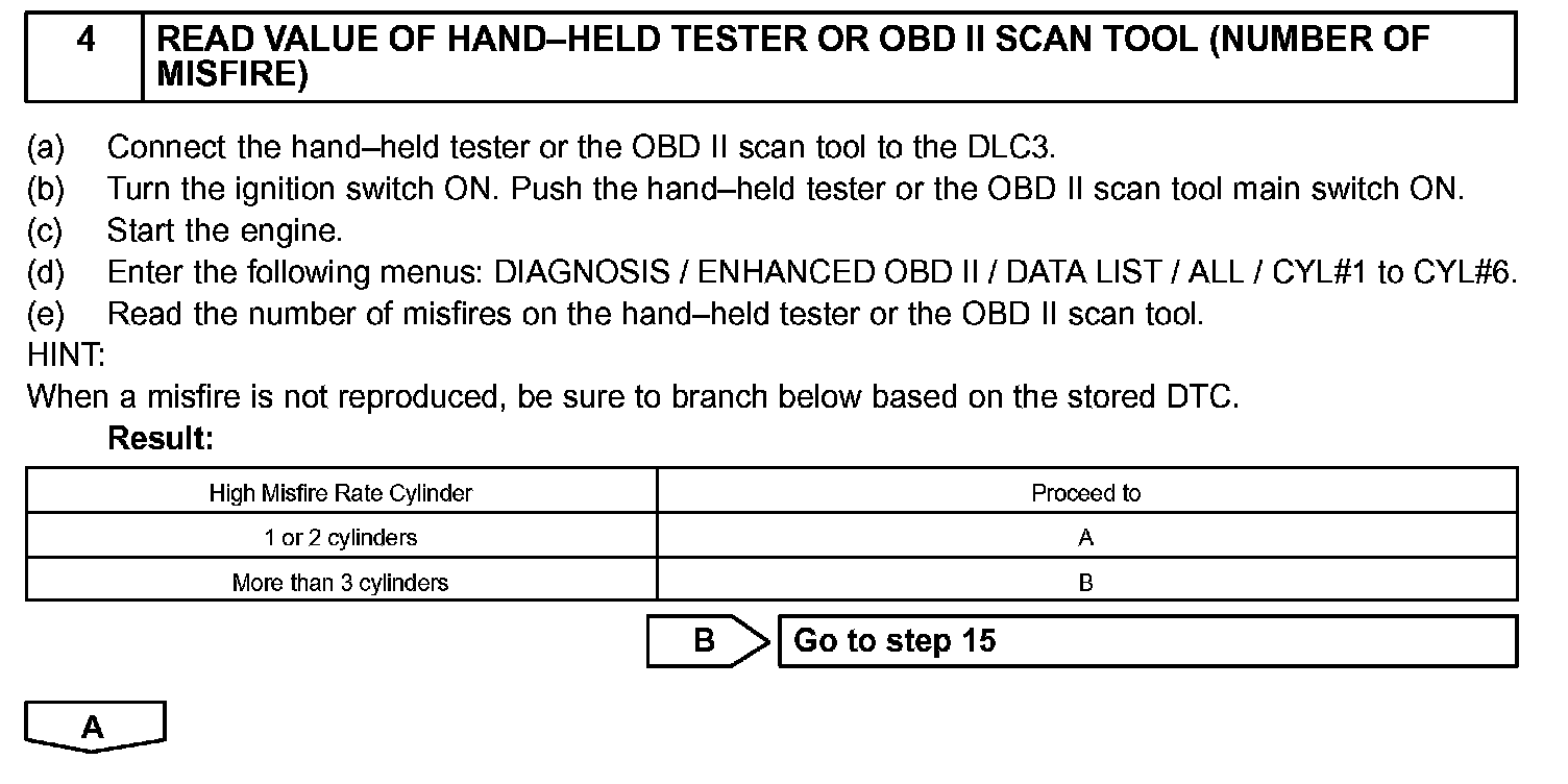 d. Read the value on the misfire counter for each cylinder when idling. If the value is displayed on the misfire counter, skip the following procedure of confirmation driving.