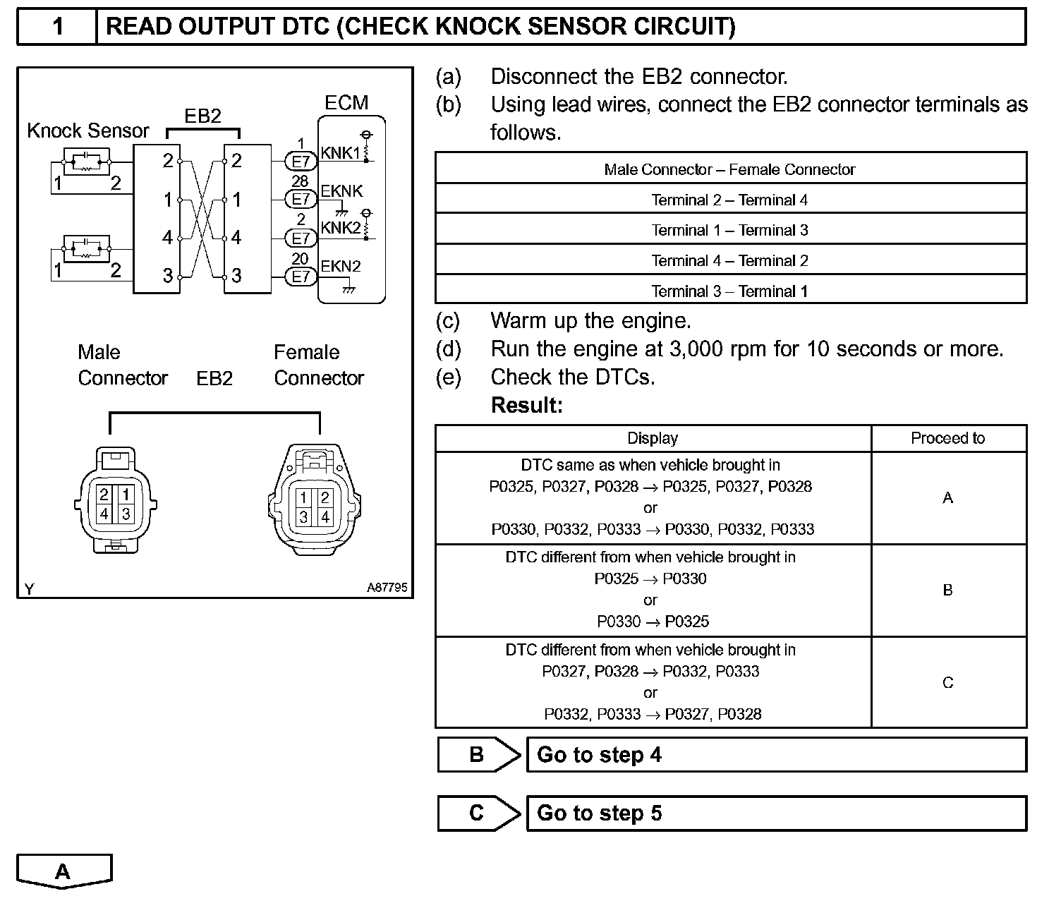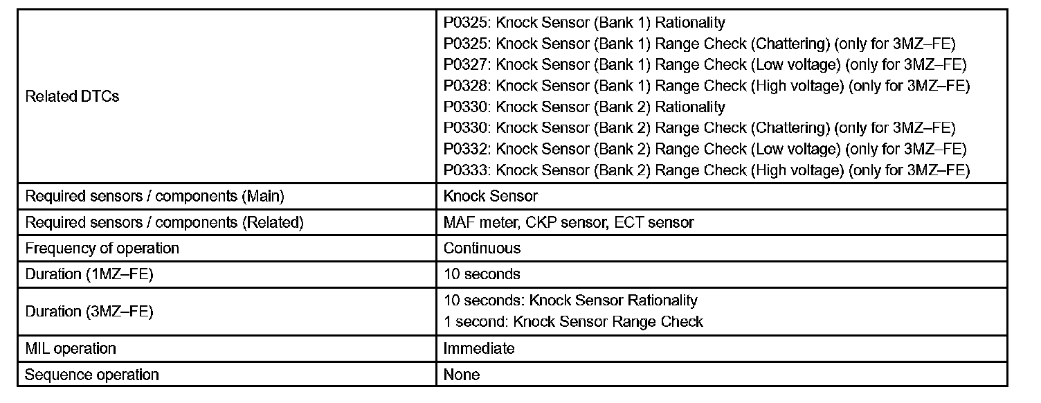 - DTC P0325, P0327 and P0328 are for the bank 1 knock sensor circuit.