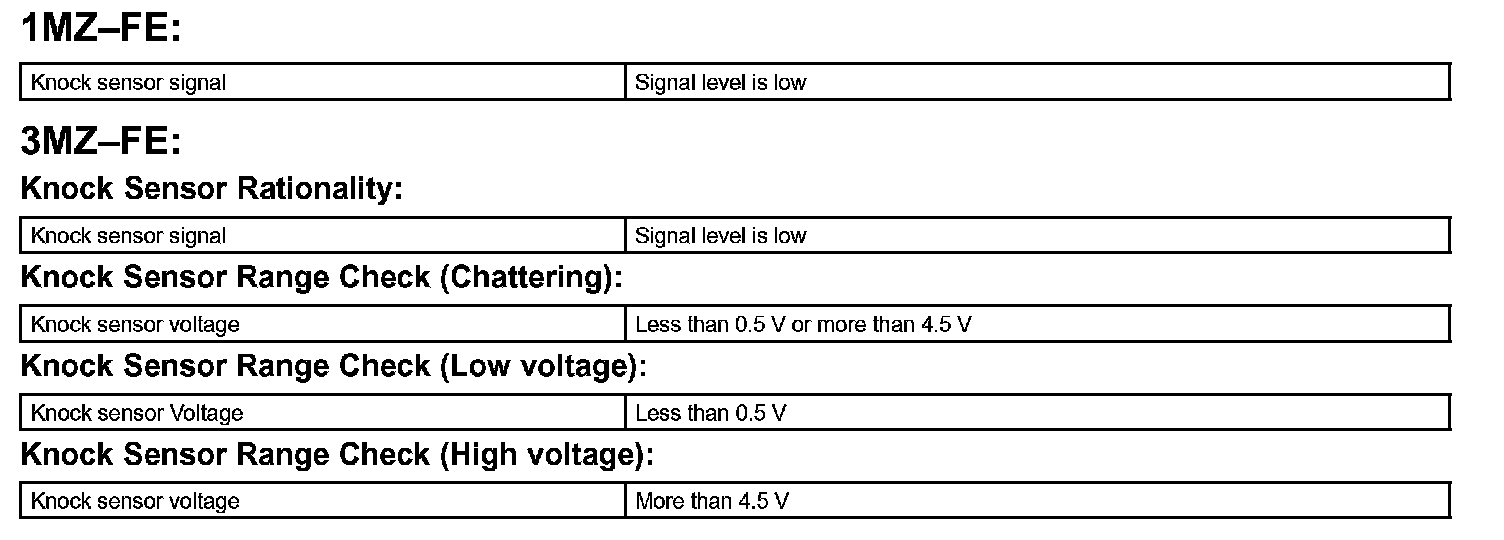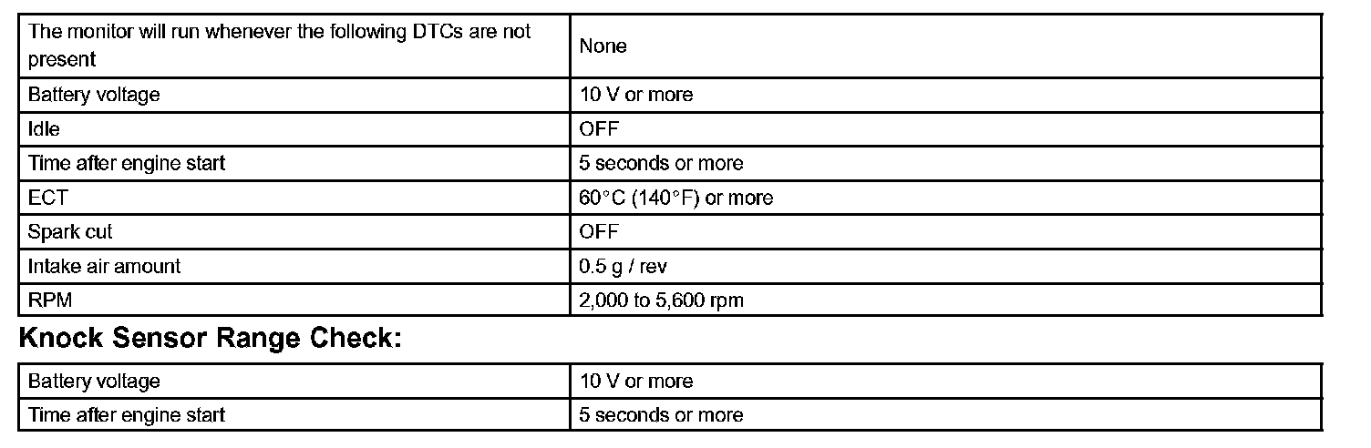 The ECM also senses background engine noise with the knock sensor and uses this noise to check for faults in the sensor. If the knock sensor signal level remains low for more than 10 seconds the output voltage is out of the normal range, the ECM interprets this as a fault in the knock sensor and sets a DTC.