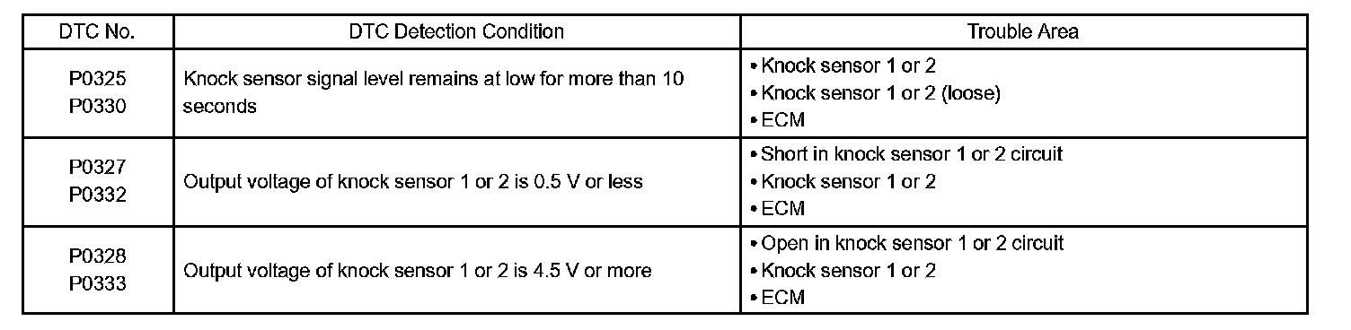 - DTC P0330, P0332 and P0333 are for the bank 2 knock sensor circuit.