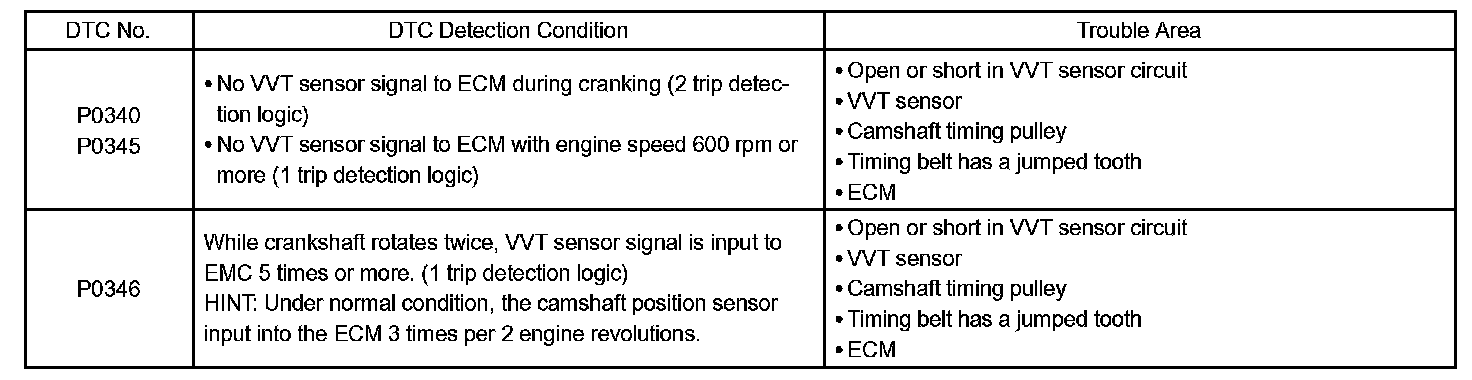 - DTC P0340 and P0345 indicate a malfunction related to the VVT sensor (+) circuit