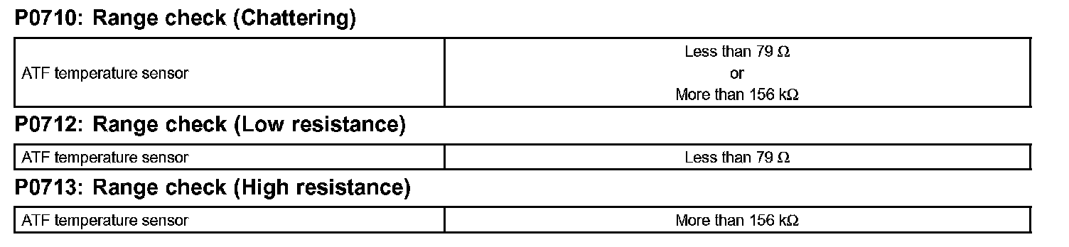 The automatic transmission fluid (ATF) temperature sensor converts ATF temperature to an electrical resistance value. Based on the resistance, the ECM determines the ATF temperature, and the ECM detects an opens or shorts in the ATF temperature circuit. If the resistance value of the ATF temperature is less than 79 Ohms *1 or more than 156 kOhms *2, the ECM interprets this as a fault in the ATF sensor or wiring. The ECM will turn on the MIL and store the DTC.