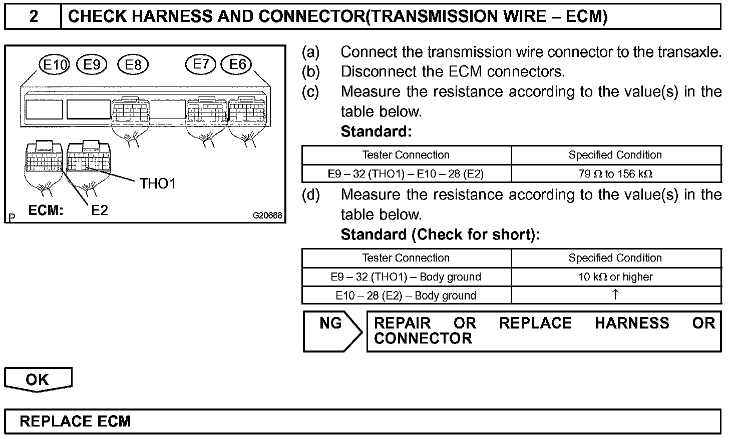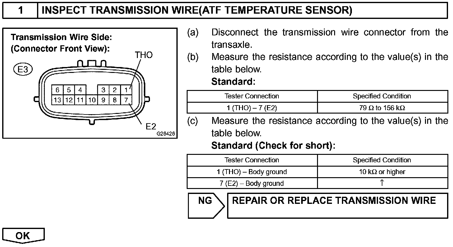 The sensor resistance changes with the transmission fluid temperature. As the temperature becomes higher, the sensor resistance decreases.