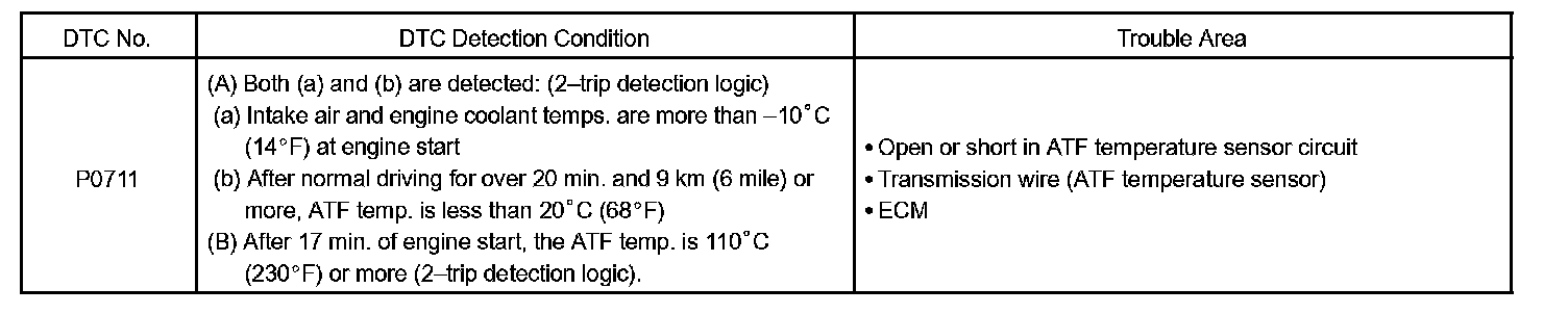When the ATF temperature is 110 °C (230 °F) or more after 17 minutes of engine cold start, the ECM also determines this as a fault, turns on the MIL, and stores the DTC.