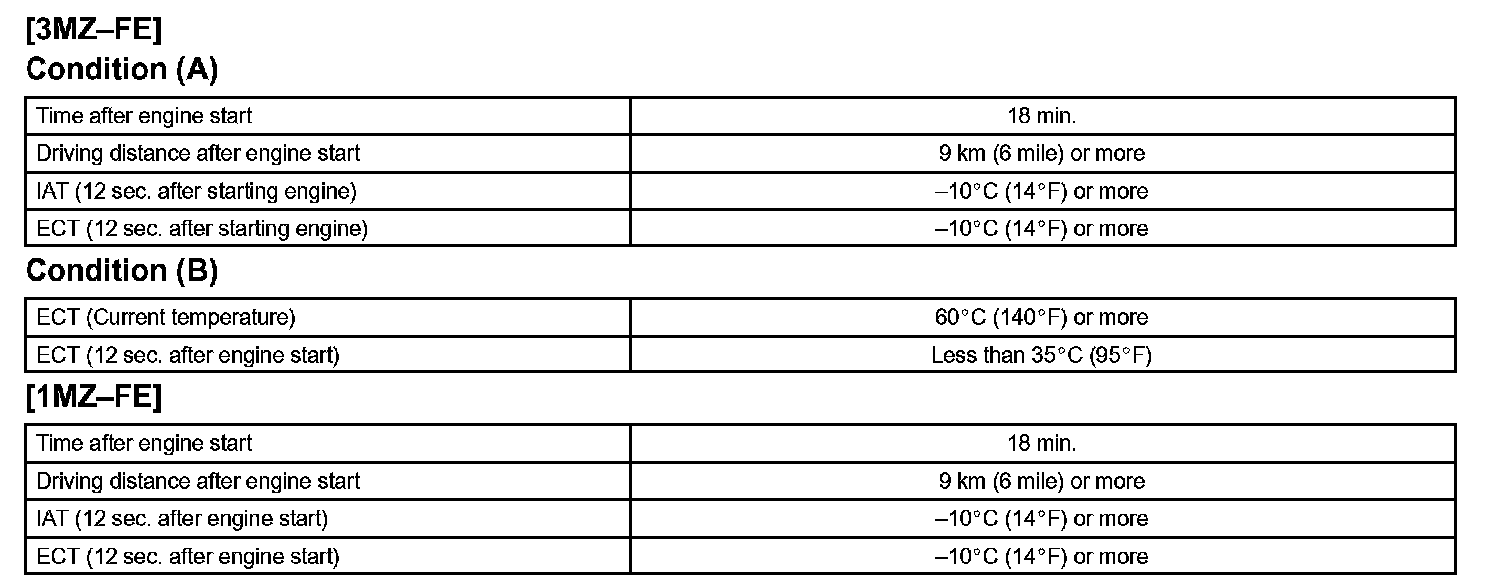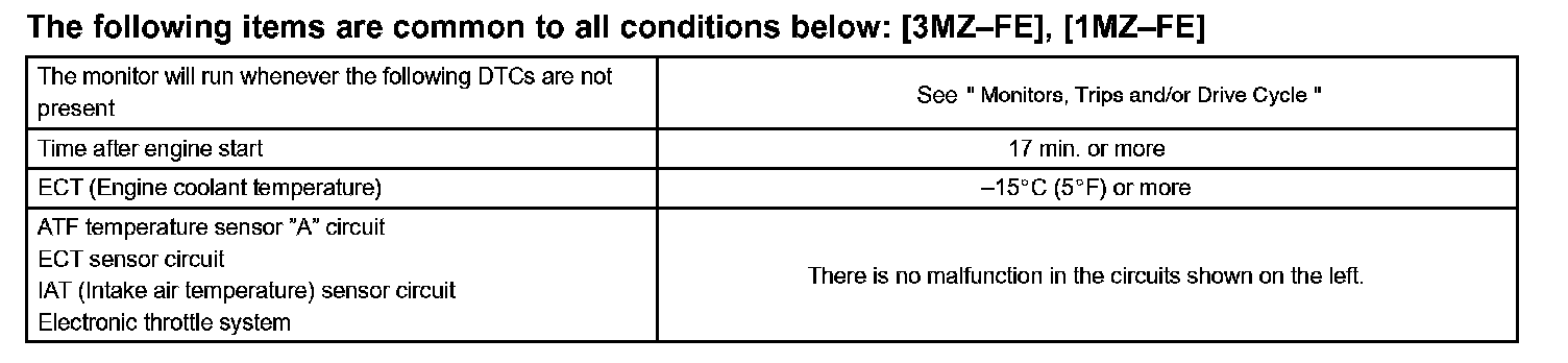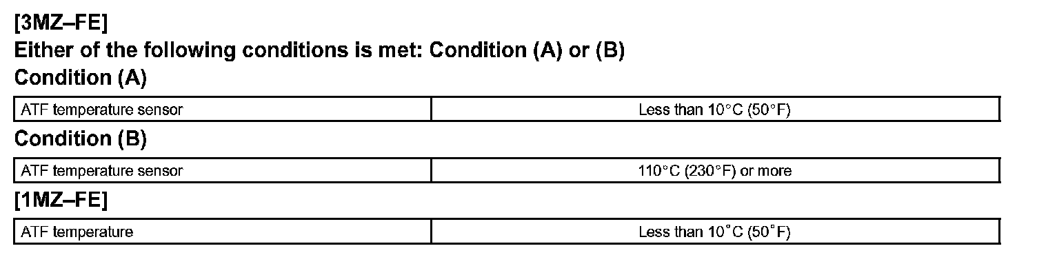 After running the vehicle for a certain period, the ATF temperature should increase. If the ATF temperature is below 10 °C (50 °F) after running the vehicle for a certain period, the ECM interprets this as a fault, and turns on the MIL.