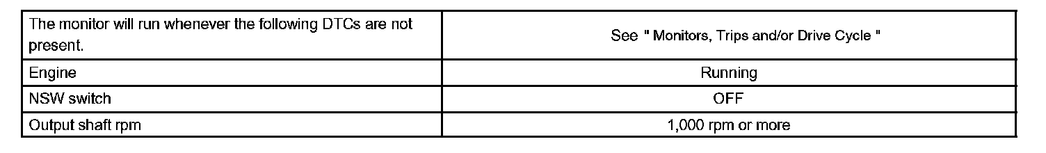 While the vehicle is operating in the 2nd, 3rd, 4th or 5th gear position in the shift position of D, if the counter gear revolution is less than 300 rpm *1 although the output shaft revolution is more than 1,000 rpm *2, the ECM detects the trouble, illuminates the MIL and stores the DTC.