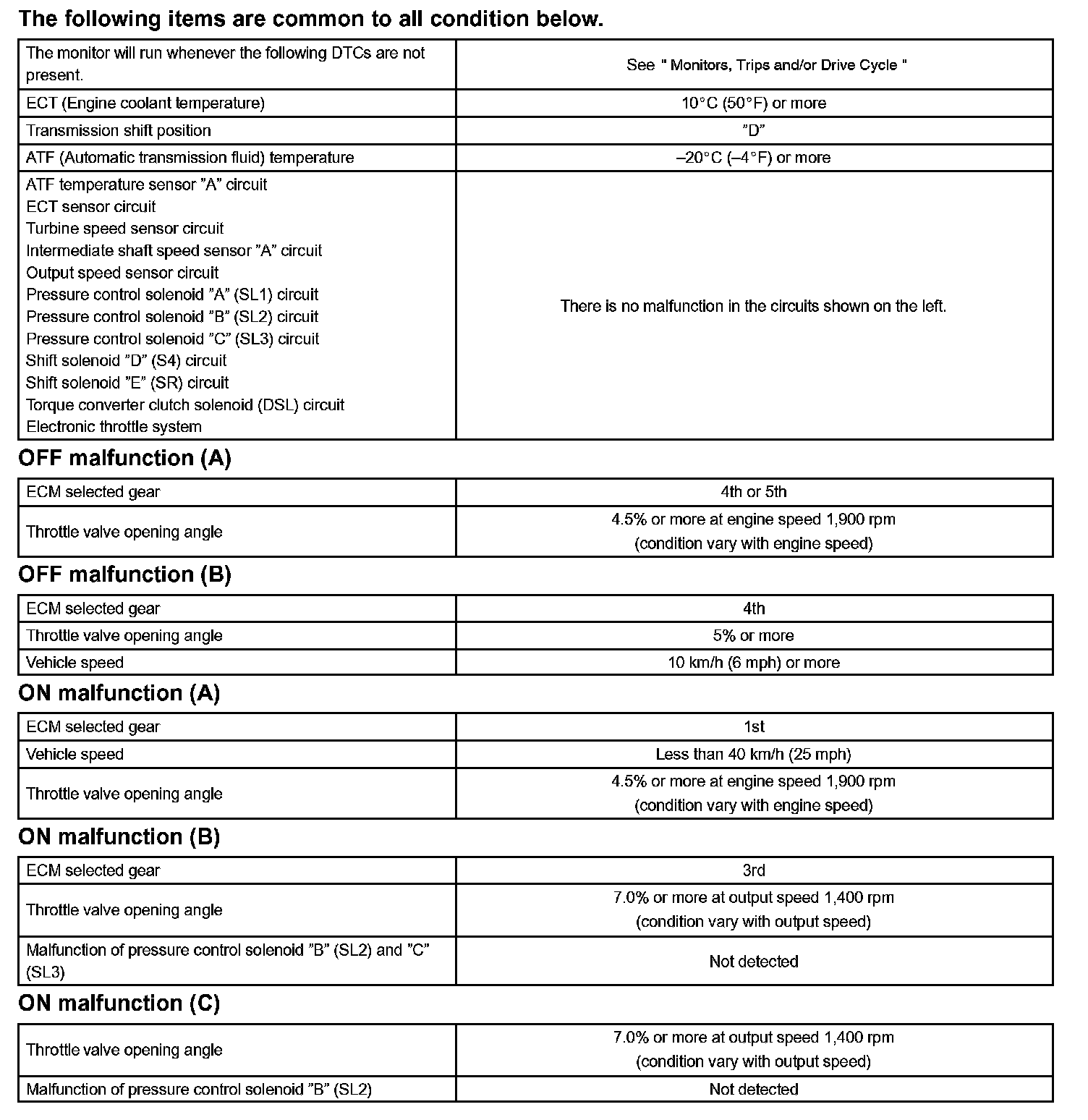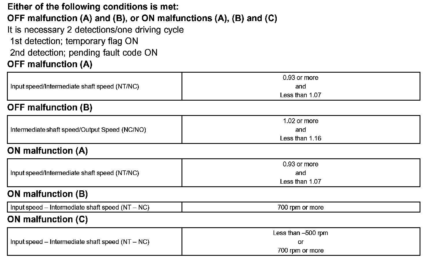 The ECM commands gear shifts by turning the shift solenoid valves "ON/OFF". According to the input shaft revolution, intermediate (counter) shaft revolution and output shaft revolution, the ECM detects the actual gear position (1st, 2nd, 3rd, 4th or 5th gear position). When the gear position commanded by the ECM and the actual gear position are not same, the ECM illuminates the MIL and stores the DTC.