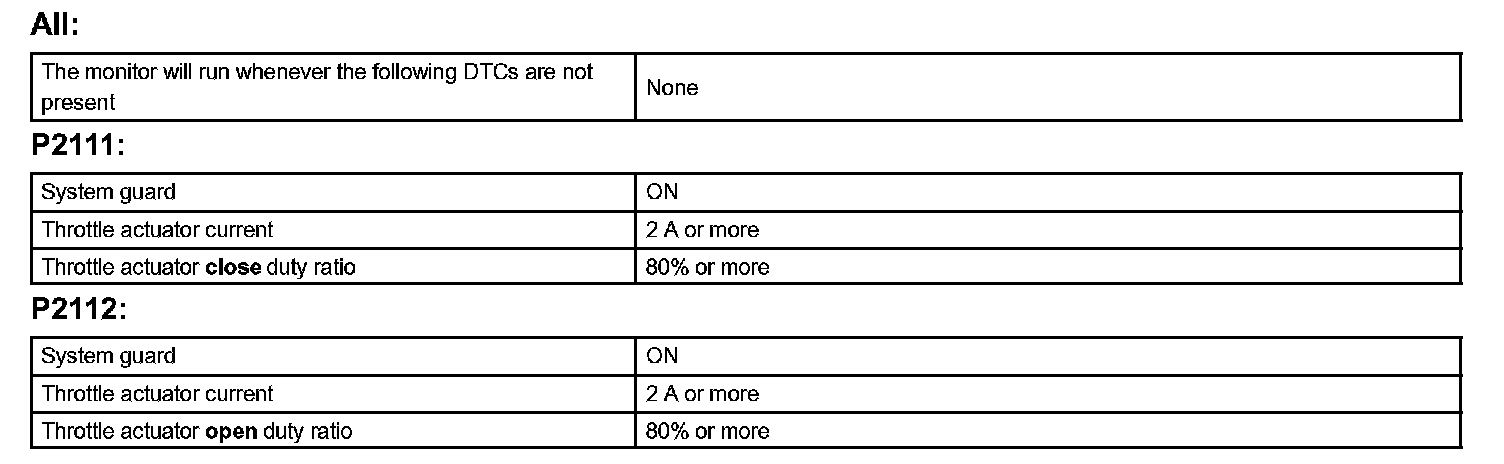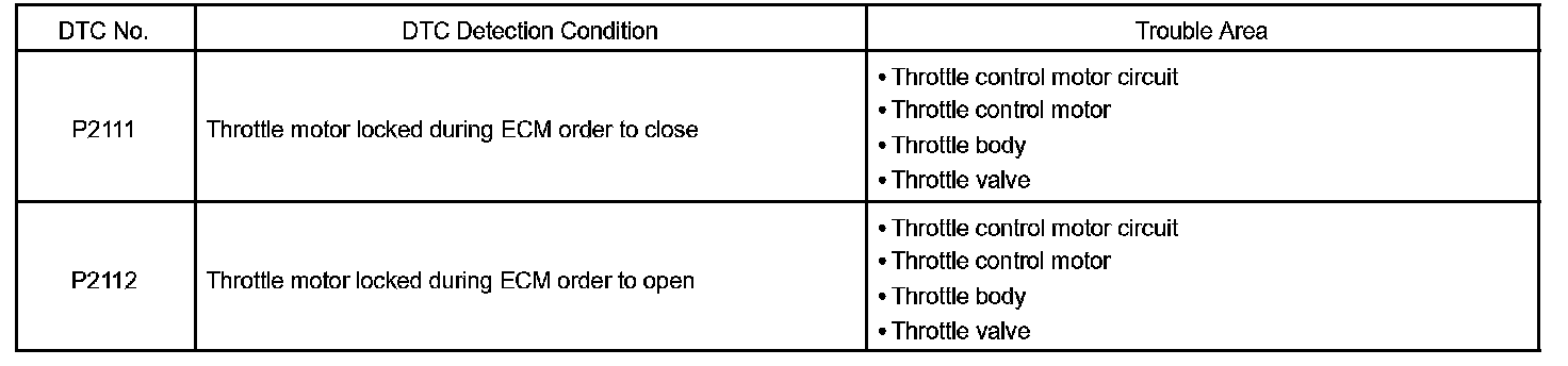 The ECM concludes that there is a malfunction of the ETCS when the throttle valve remains at a fixed angle despite high drive current from the ECM. The ECM will turn on the MIL and a DTC is set.
