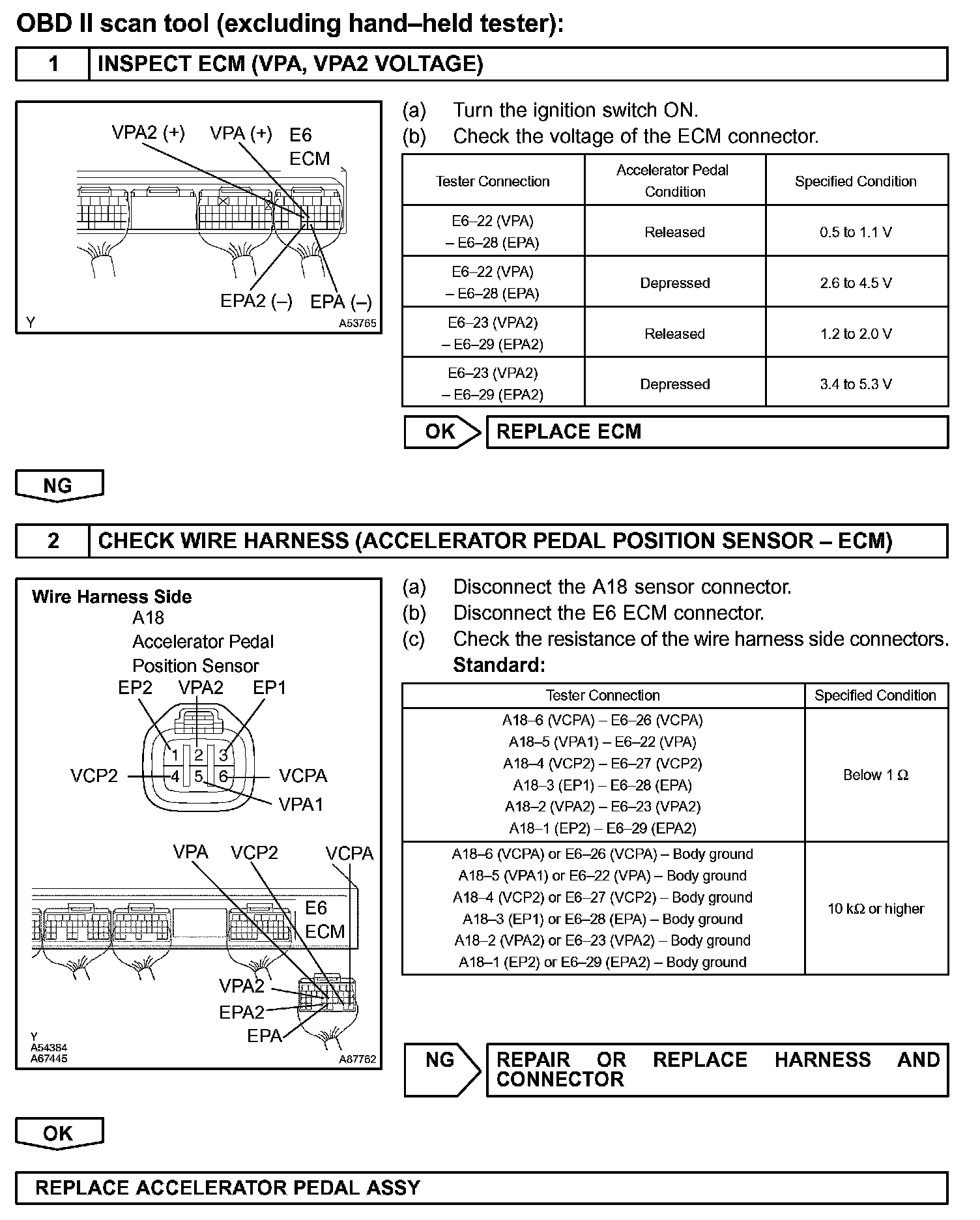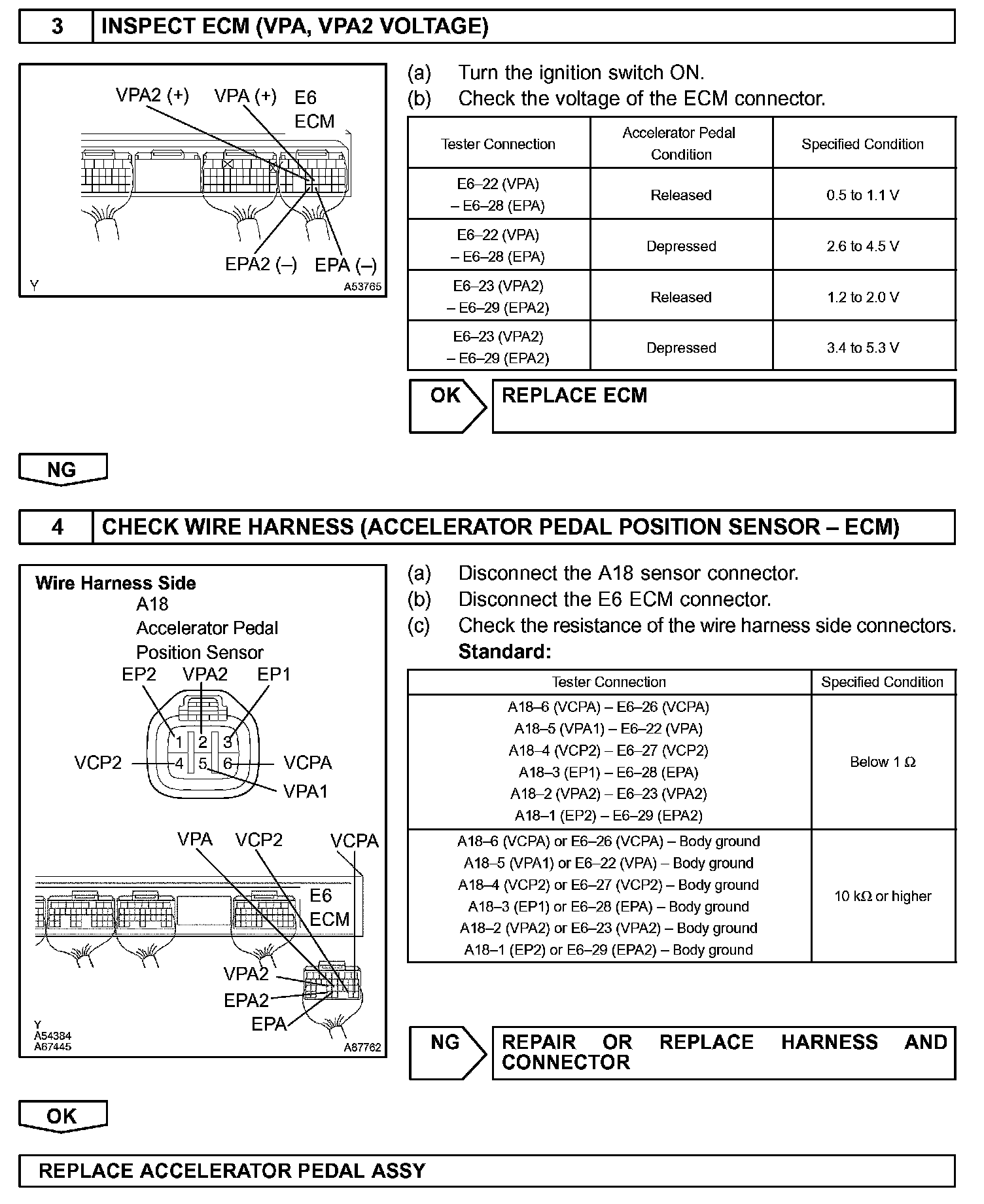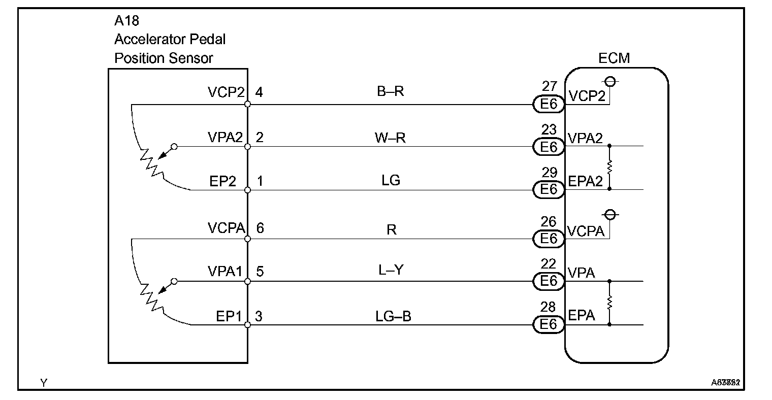 The accelerator pedal position sensor is mounted on the accelerator pedal bracket. The accelerator pedal position sensor has 2 sensor elements / signal outputs: VPA1 and VPA2. VPA1 is used to detect the actual accelerator pedal angle (used for engine control) and VPA2 is used to detect malfunctions in VPA1. Voltage applied to VPA1 and VPA2 changes between 0 V and 5 V in proportion to the accelerator pedal angle. The ECM monitors the accelerator pedal angle from VPA1 and VPA2 signal outputs, and controls the throttle motor based on these signals.