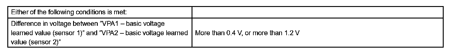 The accelerator pedal position sensor is mounted on the accelerator pedal bracket. The accelerator pedal position sensor has 2 sensor elements / signal outputs: VPA1 and VPA2. VPA1 is used to detect the actual accelerator pedal angle (used for engine control) and VPA2 is used to detect malfunctions in VPA1. When the difference between the voltage outputs of VPA1 and VPA2 deviate from the standard, the ECM concludes the accelerator pedal position sensor has a malfunction. The ECM turns on the MIL and a DTC is set.