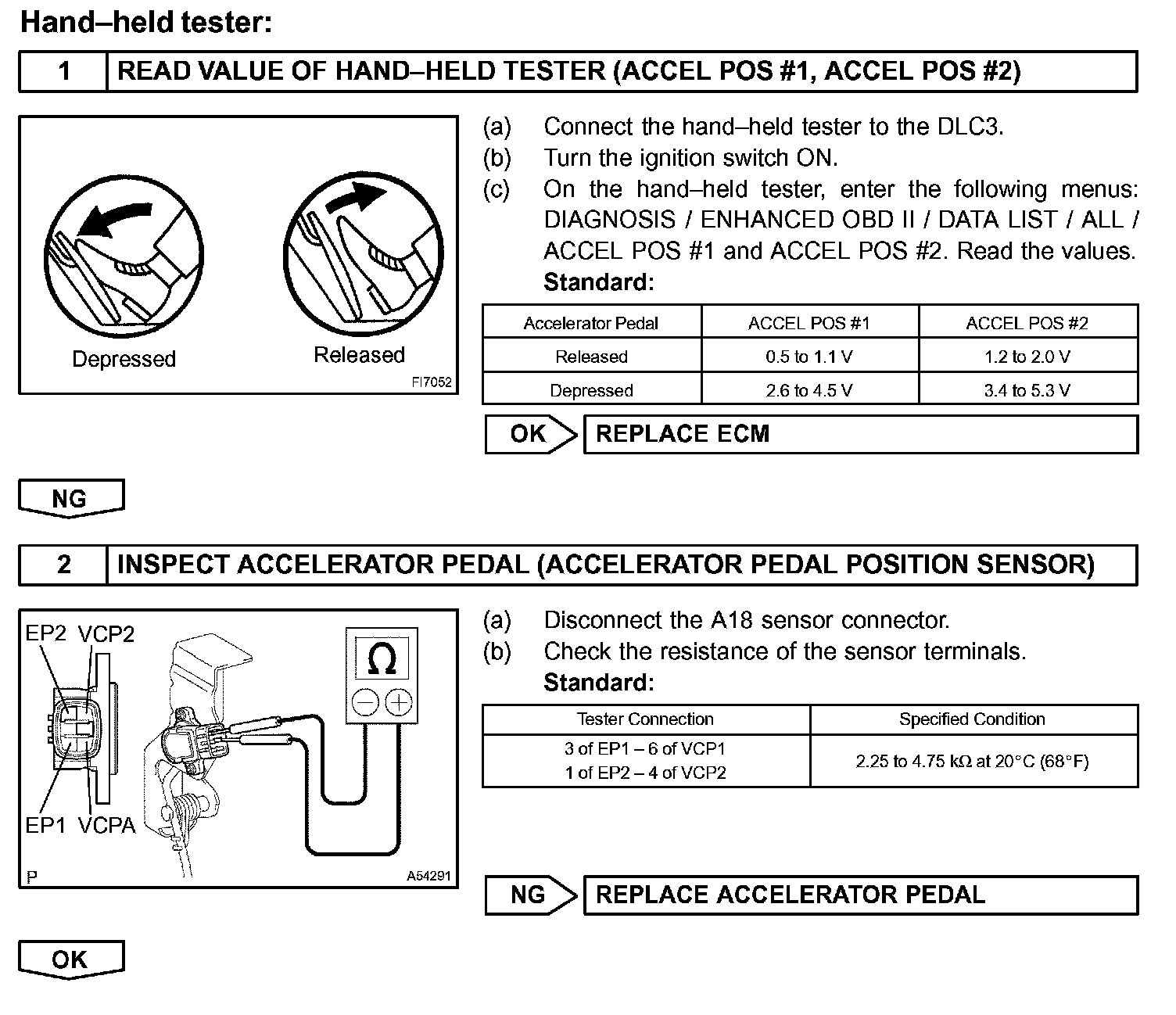 The accelerator pedal position sensor has 2 (main and sub) sensor circuits. If a malfunction occurs in either of the sensor circuits, the ECM detects the abnormal signal voltage difference between the 2 sensor circuits and switches to limp mode. In limp mode, the functioning circuit is used to calculate the accelerator pedal opening angle to allow the vehicle to continue driving. If both circuits malfunction, the ECM regards the opening angle of the accelerator pedal to be fully closed. In this case, the throttle valve will remain closed as if the engine is idling.