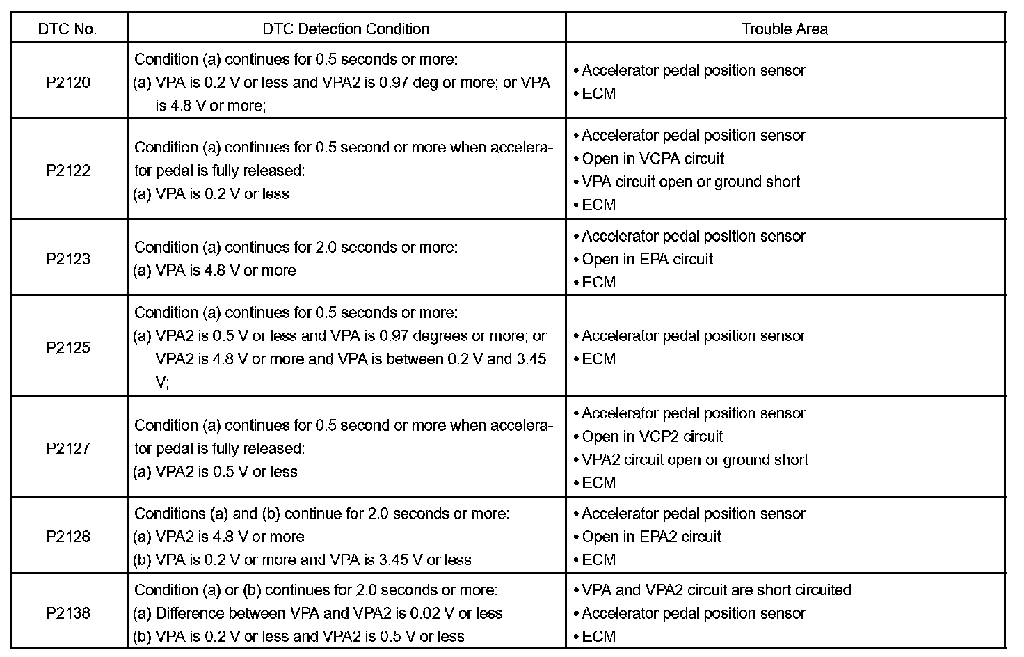 When VPA or VPA2 deviates from the standard, or the difference between the voltage outputs of the two sensors is less than threshold, the ECM concludes that there is a defect in the accelerator pedal position sensor. The ECM turns on the MIL and a DTC is set.
