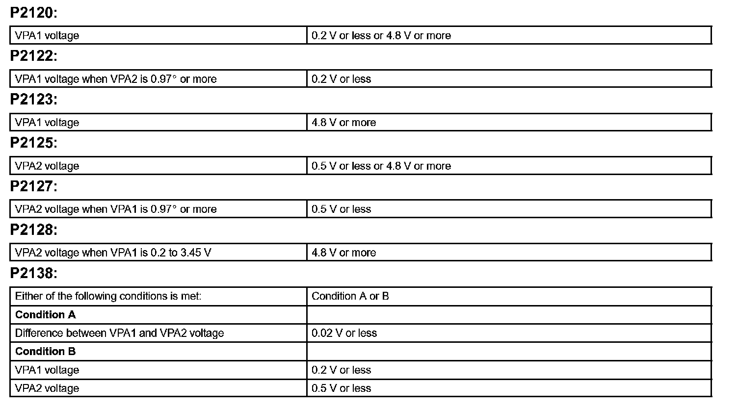 When the voltage output of the VPA is below 0.2 V or exceeds 4.8 V.