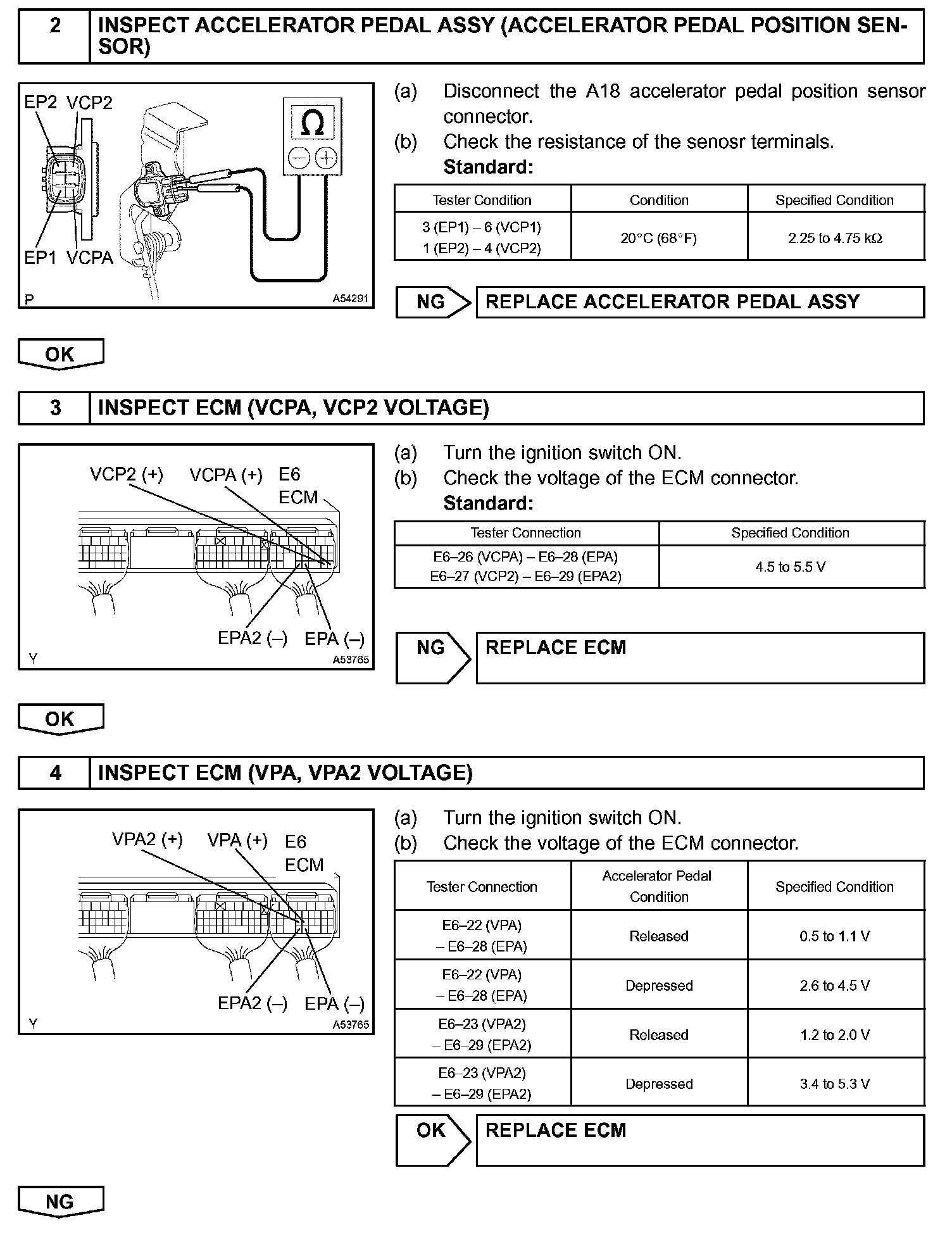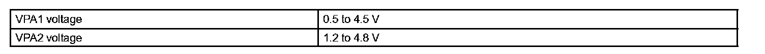 The accelerator pedal position sensor is mounted on the accelerator pedal bracket. The accelerator pedal position sensor has 2 sensor elements / signal outputs: VPA1 and VPA2. VPA1 is used to detect the actual accelerator pedal angle (used for engine control) and VPA2 is used to detect malfunctions in VPA1. Voltage applied to VPA1 and VPA2 changes between 0 V and 5 V in proportion to the accelerator pedal angle. The ECM monitors the accelerator pedal angle from VPA1 and VPA2 signal outputs, and controls the throttle motor based on these signals.