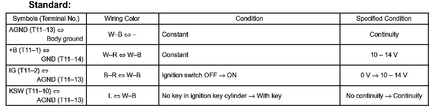 a. Disconnect the T11 ECU connector, and check the voltage or continuity between each terminal of the wire harness side connector.