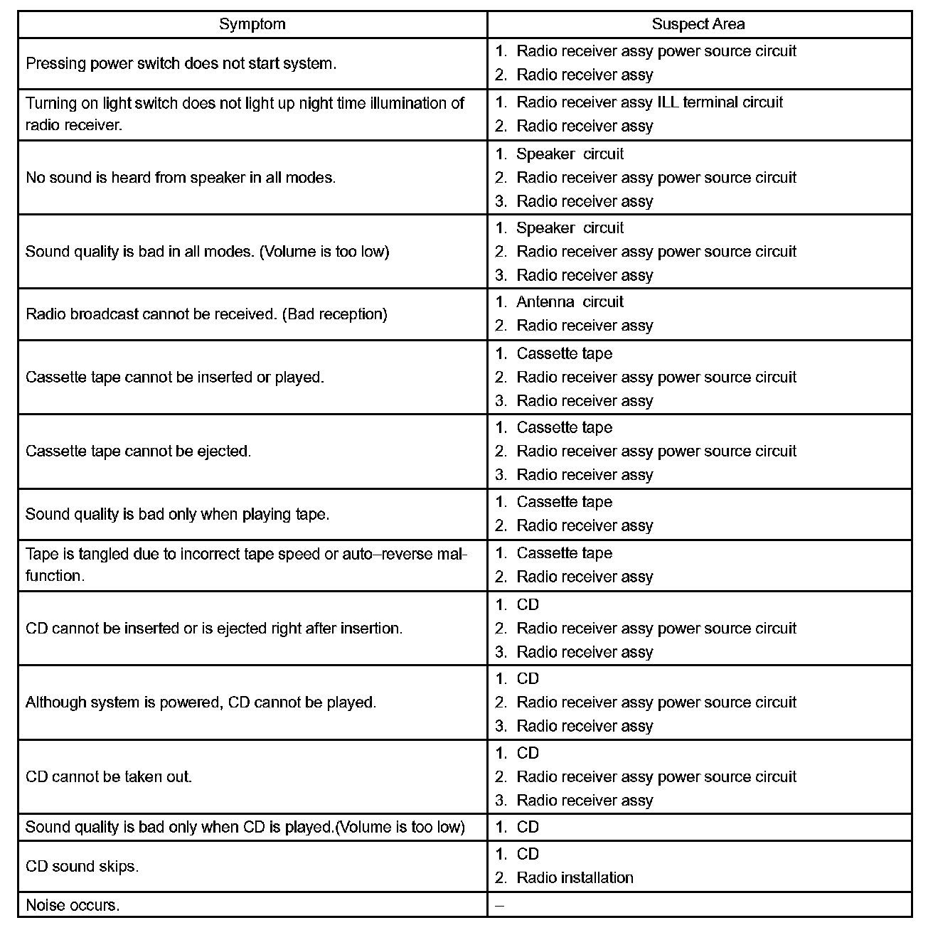 Problem Symptoms Table: