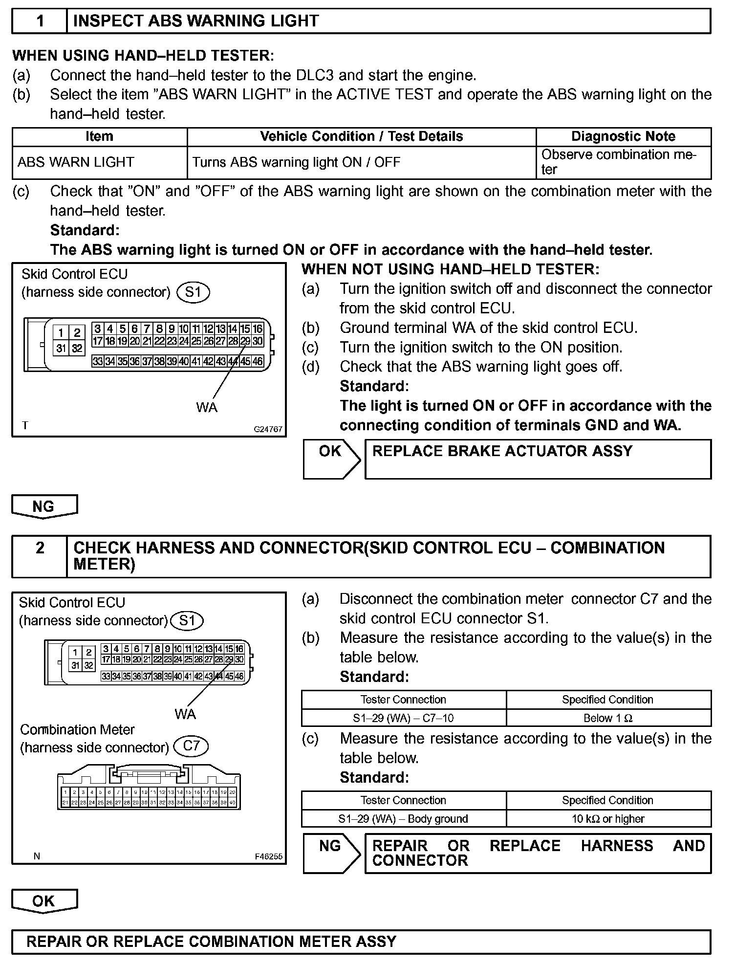 If the ECU detects trouble, it will prohibit ABS control, turn on the ABS warning light, and store the DTC. Connect terminals Tc and CG of the DLC3 to make the ABS warning light blink and output the DTC.