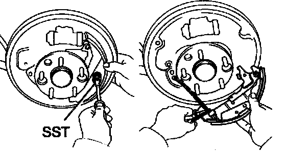 a. Using SST, connect the tension spring to the front and rear brake shoe.
