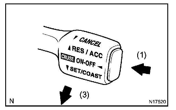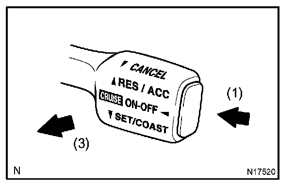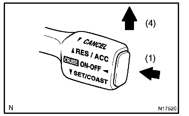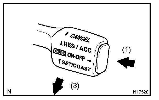 3. Check that the vehicle speed decrease while the control switch is pushed down to SET/COAST, and the vehicle cruises at the set speed when the switch is released.