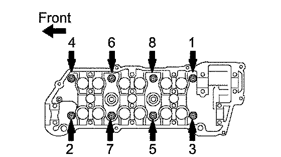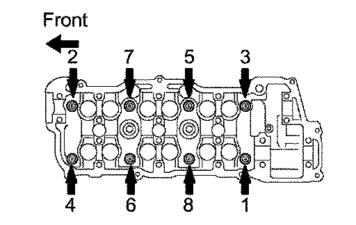 b. Uniformly loosen the 8 cylinder head bolts in the sequence shown in the illustration. Remove the 8 cylinder head bolts and plate washers.