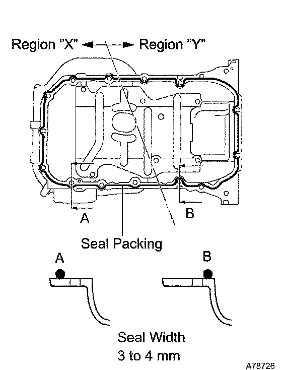 b. Apply a continuous bead of seal packing (diameter 3 to 4 mm (0.12 to 0.16 inch)) as shown in the illustration.