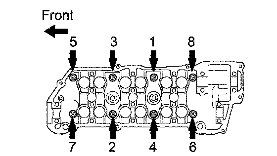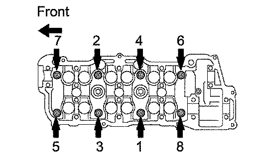 c. Uniformly install and tighten the 8 cylinder head bolts in the sequence shown in the illustration.