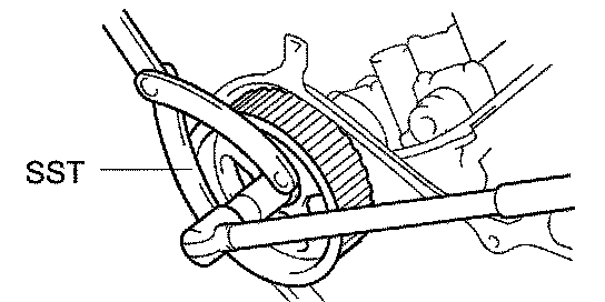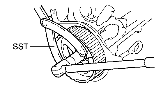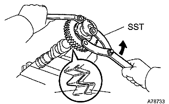 e. Using SST, align the holes of the camshaft main gear and sub-gear by turning the camshaft sub-gear counterclockwise, and temporarily install a service bolt.